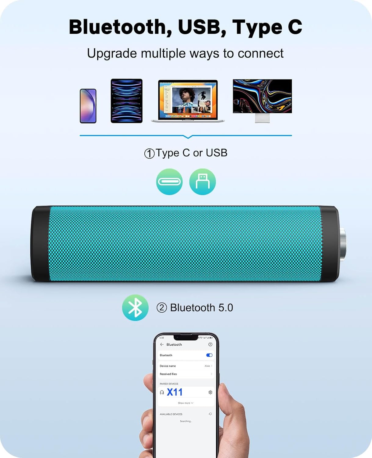 Large compatibility: PC speakers with the Bluetooth 5.3 and USB C adapter, Bluetooth can be automatically connected without manual switching, for all types of computers, PC, desktop computers, laptops, tablets, telephones and most systems.