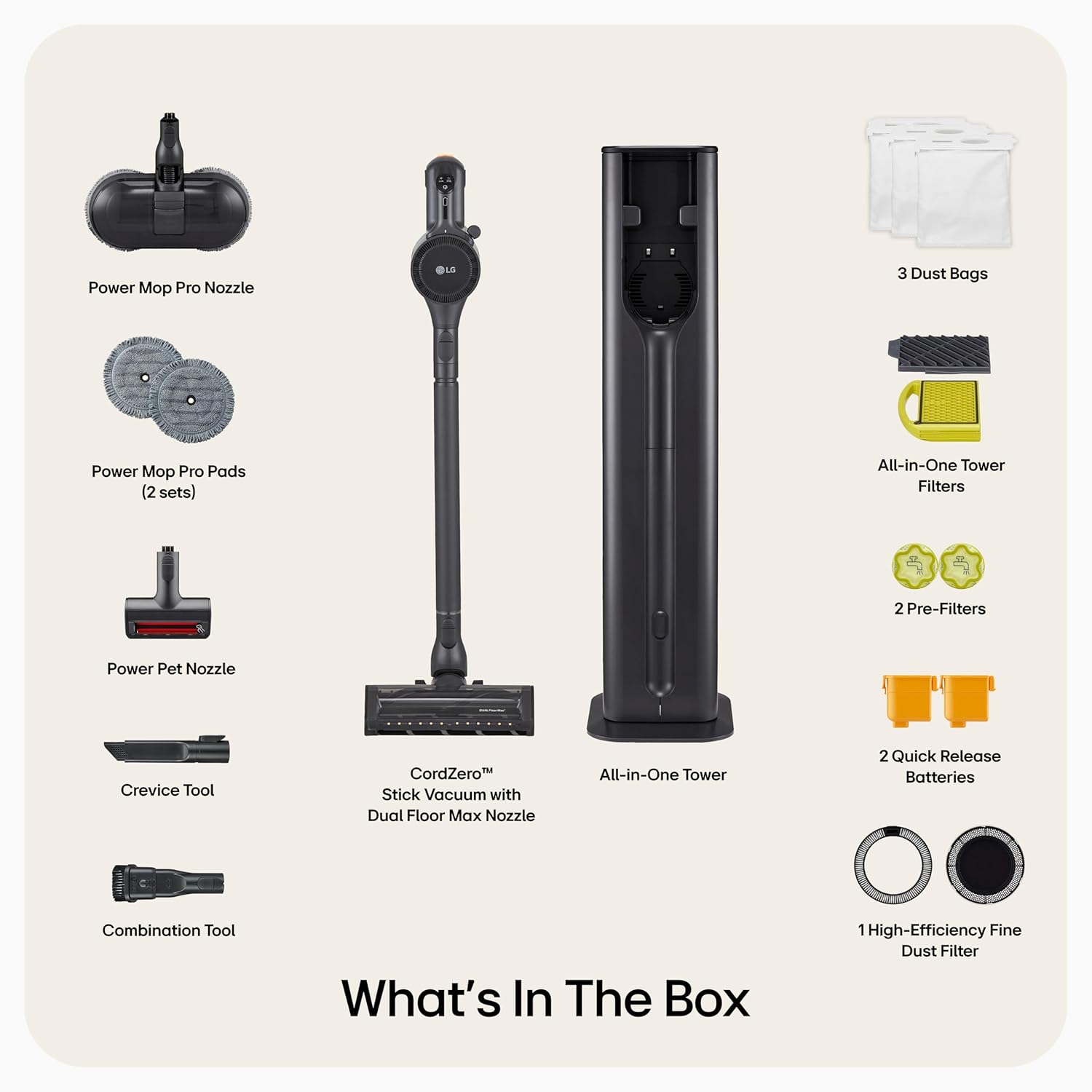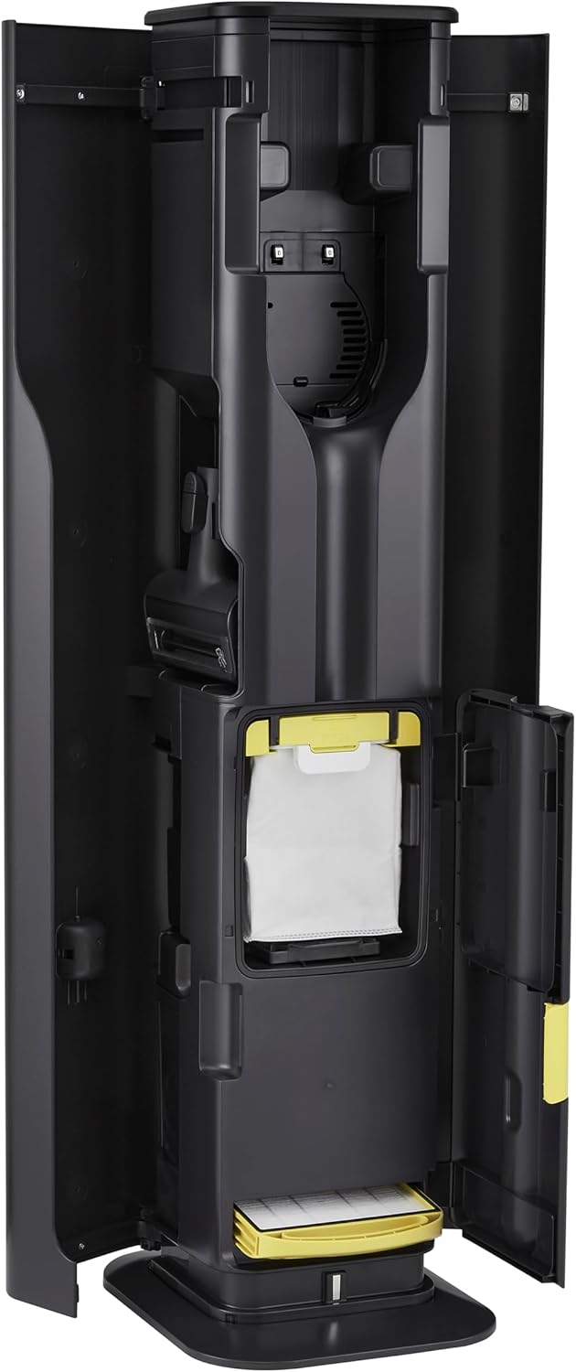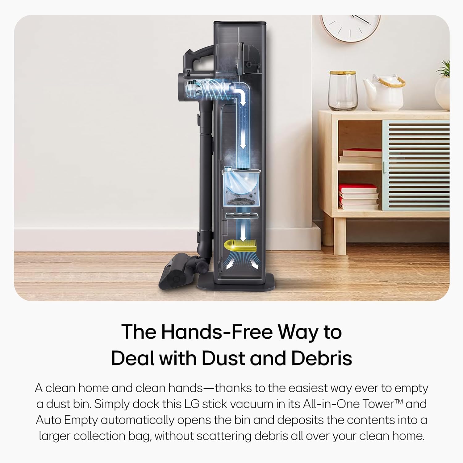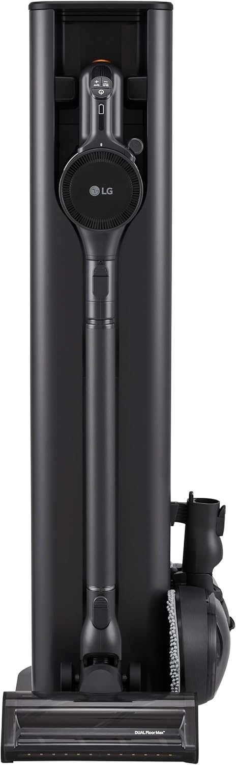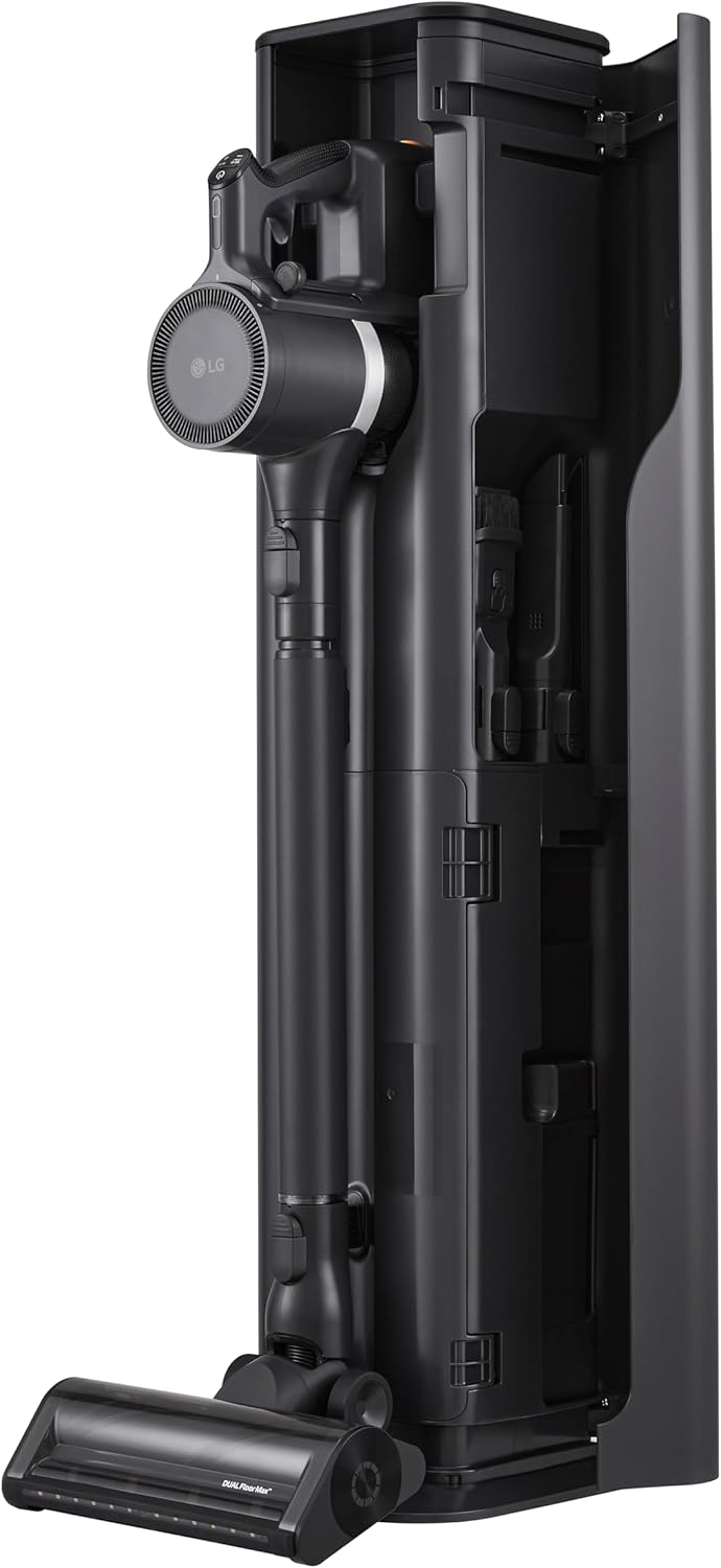 ALL-IN-ONE TOWER DESIGN WITH TOOL STORAGE: The sleek and beautiful tower design holds your LG vacuum and tools while charging both batteries and automatically emptying the dust container.