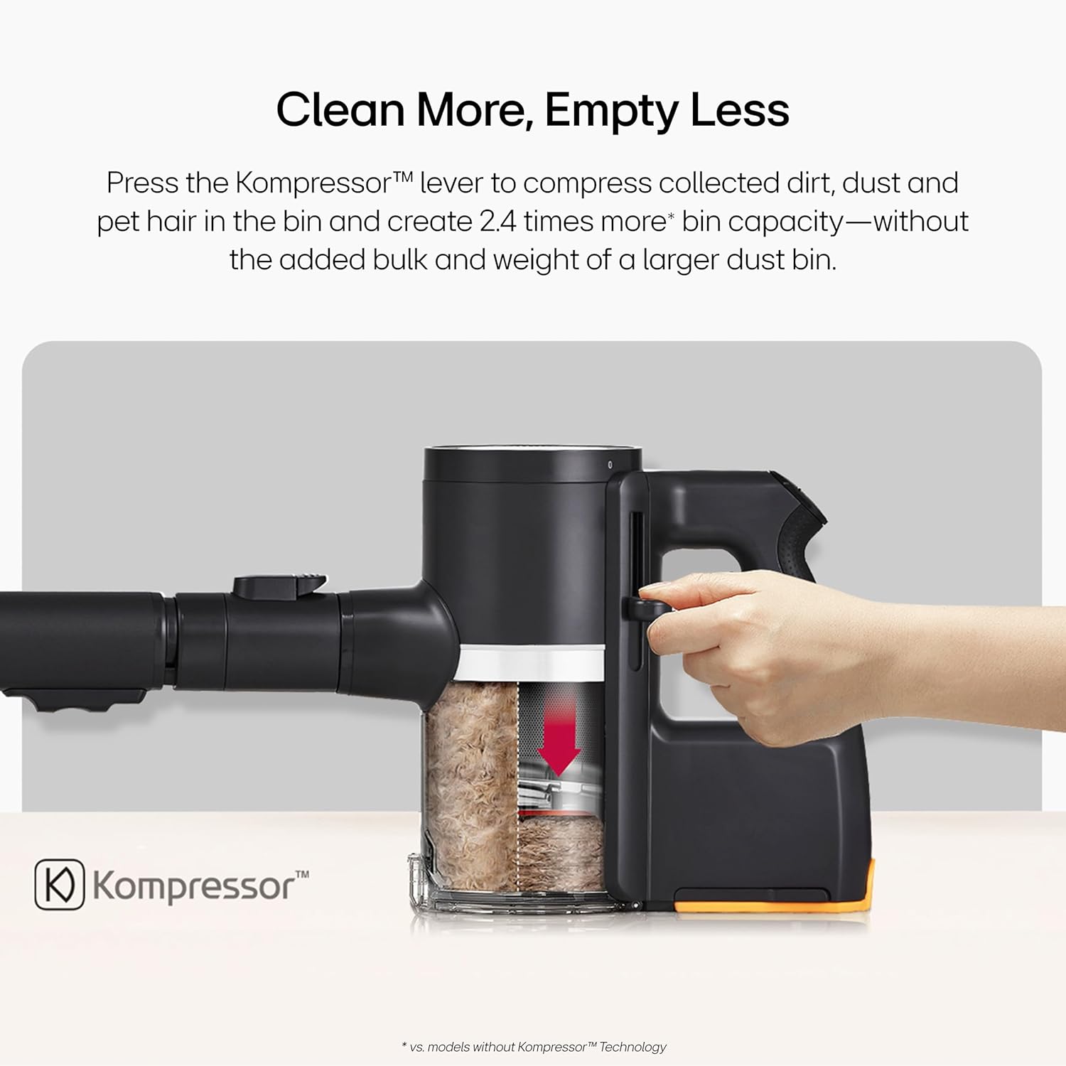 KOMPRESSOR TECHNOLOGY: Cleans more, empties less. Press the Kompressor lever to compress accumulated dirt, dust and pet hair in the bin and create 2.4×2 bin capacity, without the added volume or weight of a larger dust bin. Kompressor also allows you to easily empty the container with less dust dispersed.