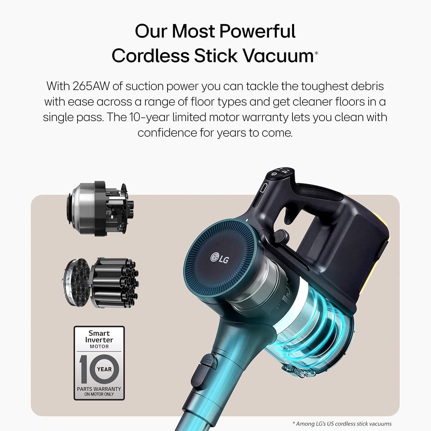 MORE POWER FOR A DEEPER CLEAN: With 265 AW of suction power, you can tackle the toughest debris with ease on a variety of floor types and get cleaner floors with just one pass. The Smart Inverter Motor's 10-year limited warranty allows you to clean with confidence for many years to come. Built to perform, built to last.