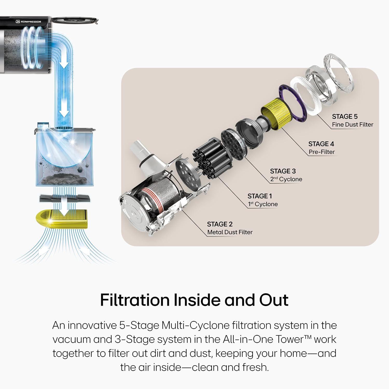 FILTRATION INSIDE AND OUT: An innovative 5-step filtration system in the vacuum and a 3-step system in the all-in-one tower work together to filter out dirt and dust, keeping your home (and the air inside) clean. clean and fresh.