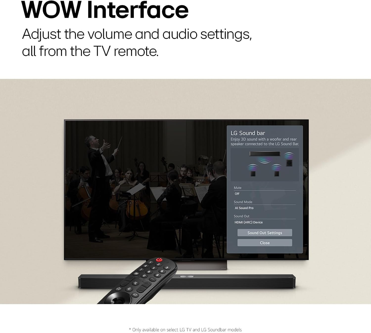 WOW interface: now, convenience is in your hand. Control your LG sound bar and TV with one remote control*. Adjust volume and audio settings, check connection status, and even select an on-screen sound mode, all from the TV's remote.