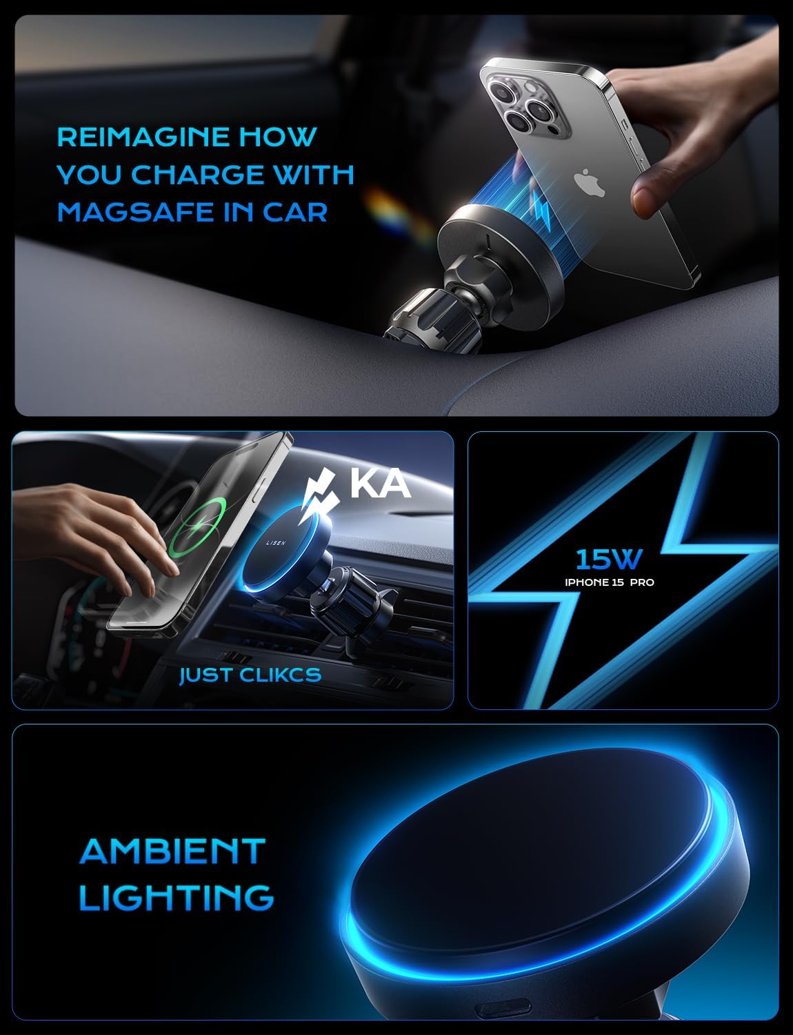 [Important Note]:LISEN Magsafe car charger is designed to fit iPhone 15, 14, 13, 12 series. For other wireless charging phones without Magsafe function, you can use our complimentary metal ring to adjust it. ①Please use a Magsafe case if you need protection. ②It is recommended to re-tighten the vent clip once every two weeks to ensure it stays stable. ③This Magsafe 3 car charger mount is not compatible with round vents.