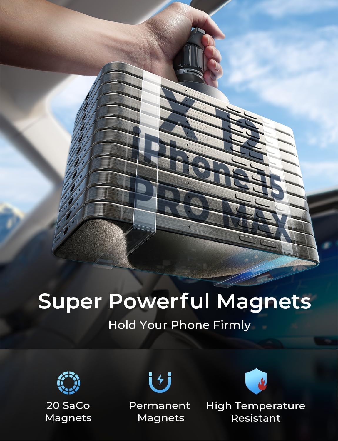 [20 Permanent Magnets]:We upgraded the magnet to a permanent magnet as the latter provides higher precision, better corrosion resistance and more excellent magnetic performance. In addition, the number of magnets on the Magsafe 3 car mount has been upgraded to 20, which can hold your phone stably and will not fall off. You no longer need to worry about your phone falling off.
