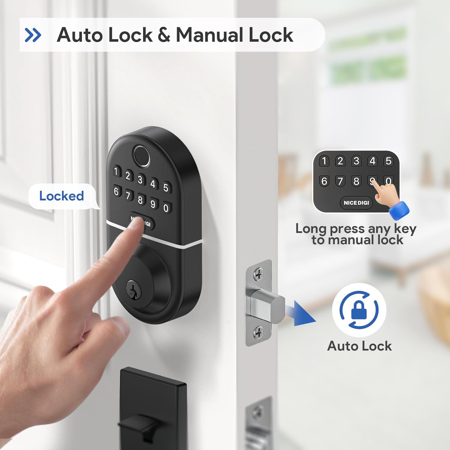 A touch lock: our Deadbolt Puerta block was automatically blocked in 5-99 seconds. Block manually from the outside, pressing long -term keys for 2 seconds, or use the blocking/unlocking of rotation inside.