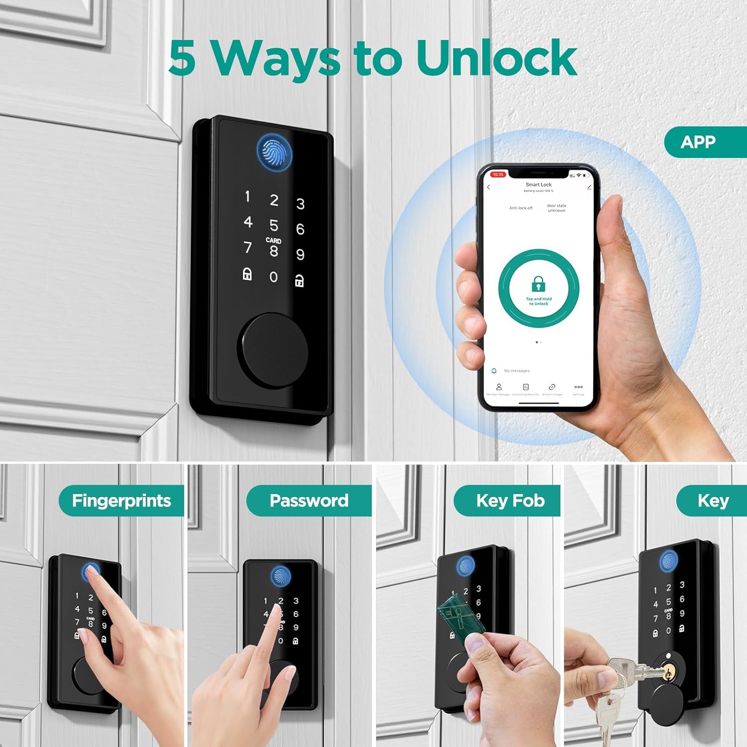 【5 in 1 Smart door block】 Intelligent block has 5 ways to unlock, such as 360 ° digital footprint, application control, anti-peep, FOB and mechanical key. You can choose any method to unlock your door. Multifunctional blockages make their lives more convenient.