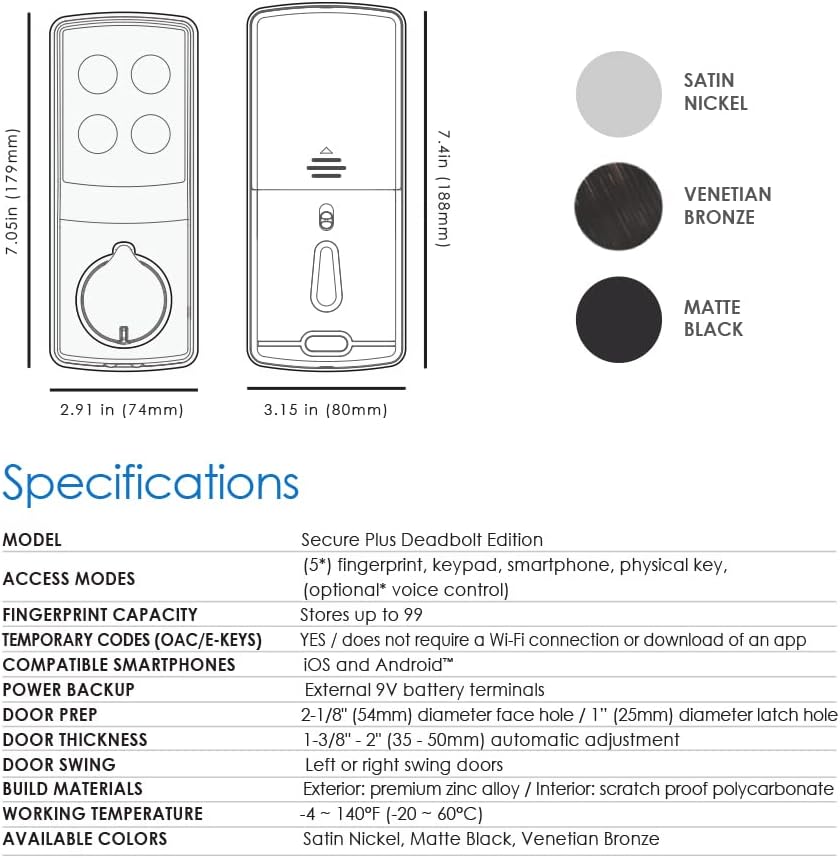 Emergency Power Supply: You can open the smart entry door lock with a 9V battery in the instant battery charging terminal if you forget to replace the dead batteries. Note: The latch has an adjustable backset of 2 3⁄8” or 2 3⁄4” to fit most standard doors. (Please verify your door measurements before purchasing this smart lock.) You can find the installation manual, user manual, and specification sheet in the Technical Specifications section for additional information.