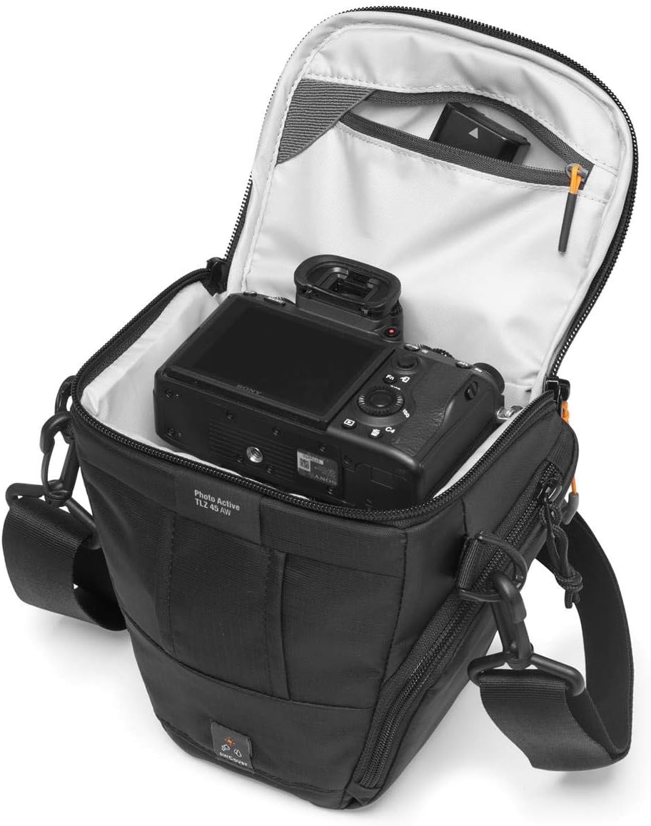 Get solid protection with the active fast access compact photo TLZ 45 AW. From a one -day walk to vacation trips, Photo Active keeps the camera's accessible and protected camera so that it can capture and share its trip. It adapts to a Sony Alpha 9 with 24-70 mm F/2.8 attached. Use two ways for maximum comfort: throughout the body or by the built -in belt loop. Keep accessories organized with inner zipper pocket and two external pockets for small items such as memory cards and batteries. The entire AW climate is included protects the elements of the elements.