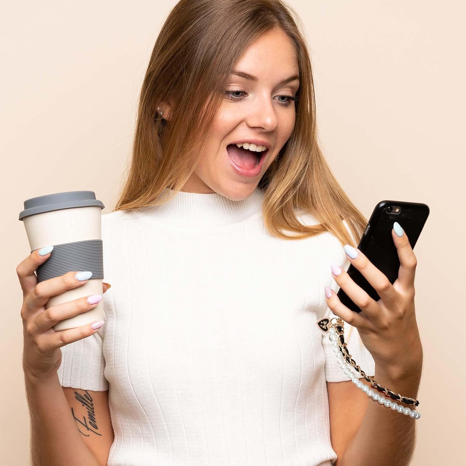 This telephone chain bracelet is light and will not make your hands feel tired, which makes it perfect to use your phone on your wrist. In addition, it can also be used as a bag chain, bag extender chain, etc.
