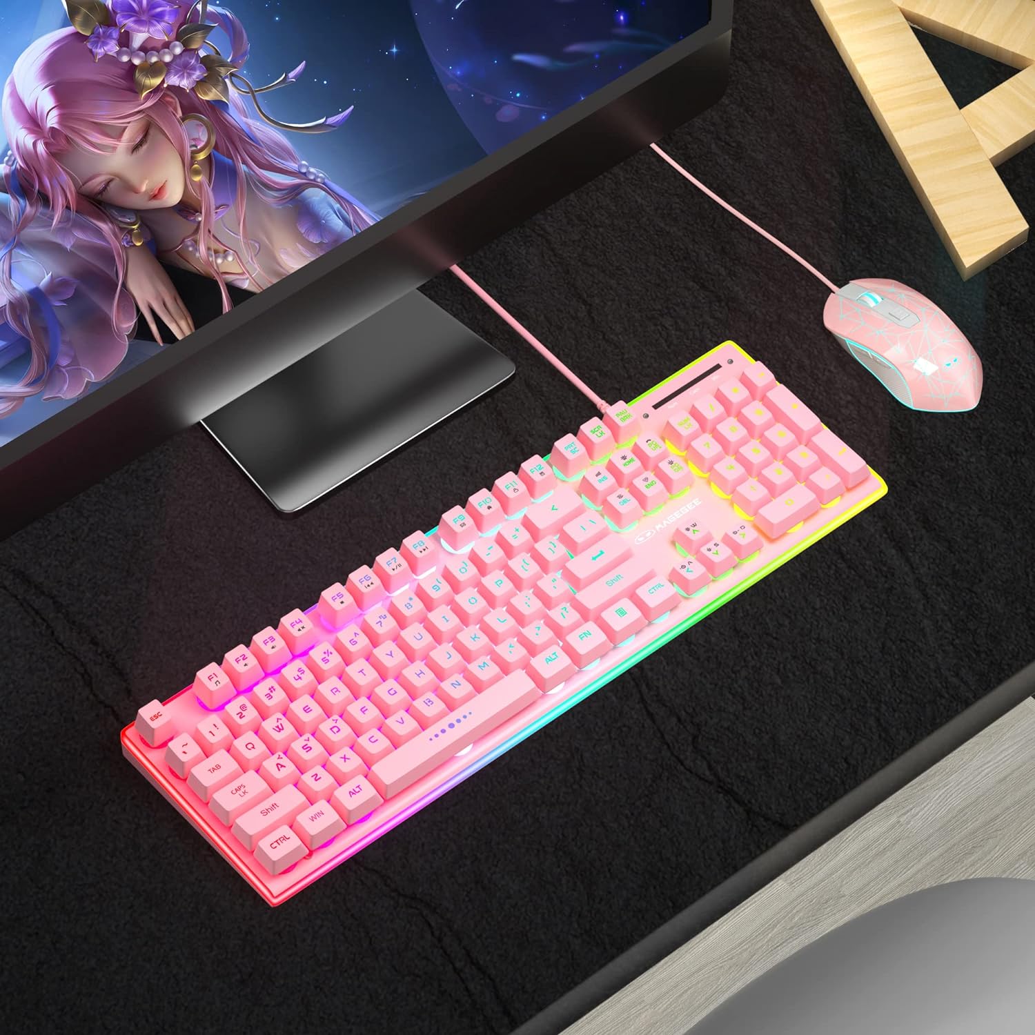 BEAUTIFUL RGB BACKLIGHT: It has true cool RGB effects and 6 kinds of single color backlight, surround brightness of all four sides of the keyboard, press K/M to adjust your favorite light mode, FN+↑/↓ controls the brightness of the backlight, FN + ← / → controls the speed of the backlight.