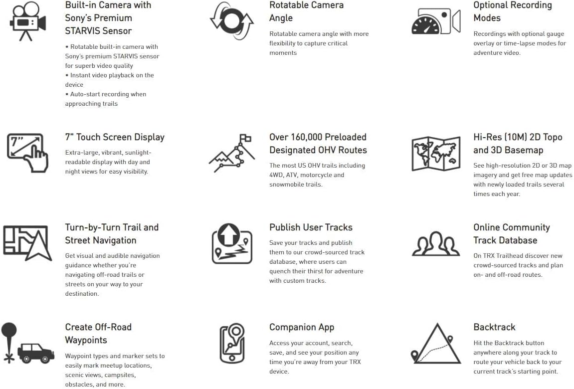 The Magellan TR7 Cam GPS Trail and Street Navigator with Camera has been enhanced with a rotating built-in camera featuring Sony’s STARVIS Premium Sensor, so your ride can be recorded in excellent video quality. The TR7 camera will automatically start recording when you get close to the trails. Gauge Overlay or Time Lapse modes are optional for adventure videos. Instant video playback on the device is always a good idea to re-watch your extraordinary performance. Like the TRX7, the TR7 Cam is equipped with a 7” HD touchscreen and our award-winning off-road navigation software, giving you turn-by-turn directions on ATV trails and streets. The TR7 Cam comes preloaded with over 160,000 designated ATV routes from forests and public lands and includes Magellan’s award-winning street navigation to take you right from your starting point to the trail. Search for trails with your TR7 Cam or find trails in an ever-growing crowdsourced trail database at www.TRXTrailhead.com. Magellan’s trail database contains over 160,000 preloaded ATV routes and user-generated tracks created by other off-roaders. The community database can be accessed via desktop, tablet, or mobile device, and crowdsourced trails contain personal observations so you can search by location, trail difficulty, ratings, and more.