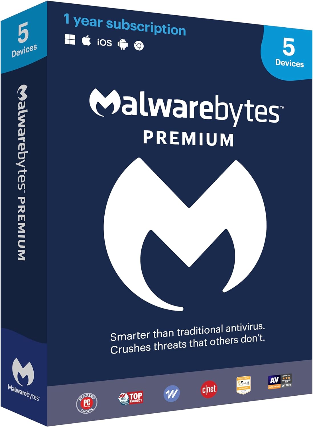 Malwarebytes Premium for 5 devices, 1 year subscription. Multi-device for PC, Mac, Android. Your comprehensive defense against established and emerging threats. Malwarebytes Premium is an antivirus replacement, protecting you and your devices from malware, ransomware, viruses, adware, spyware, malicious websites, and more. It can identify threats no one has ever seen before, so you are protected from tomorrows online threats today.