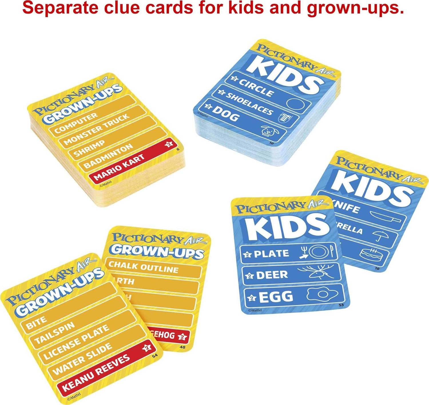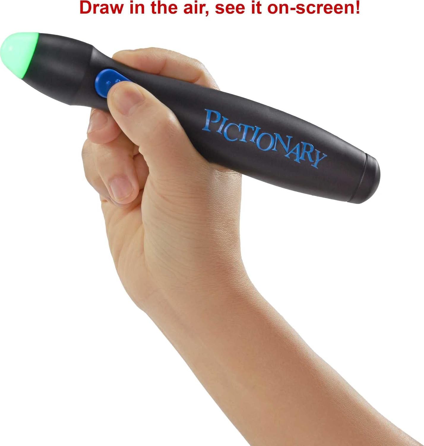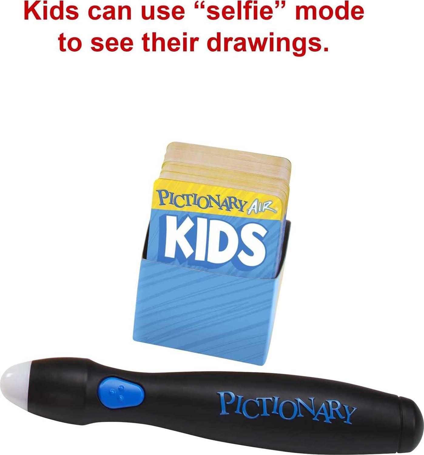 Pictionary Air is a fun way to play the classic family drawing game. Now, with Pictionary Air Kids vs. Grown-Ups, kids will find it easier to draw in the air and see it on the screen. Adults use the updated classic clues, while kids have clues that include illustrations, making it easier for kids as young as 6 to join in on the fun. Interact with the drawings, like in charades, to make this even more exciting take on the quick-draw classic. Download the Pictionary Air app on a smartphone or tablet to get started. Point the app’s camera at the illustrator and they’ll appear, along with the sketch, on the smart device’s screen. Kids have the option to use a “selfie mode” in the app to see their drawings. For even more laughs, players can stream their drawings from their smart device to their TV using Apple TV, Chromecast, or a similar streaming device. A compatible streaming device is required. See the Pictionary Air online support page for device compatibility. This family game brings lots of fun to any game night or party. Colors and decorations may vary.