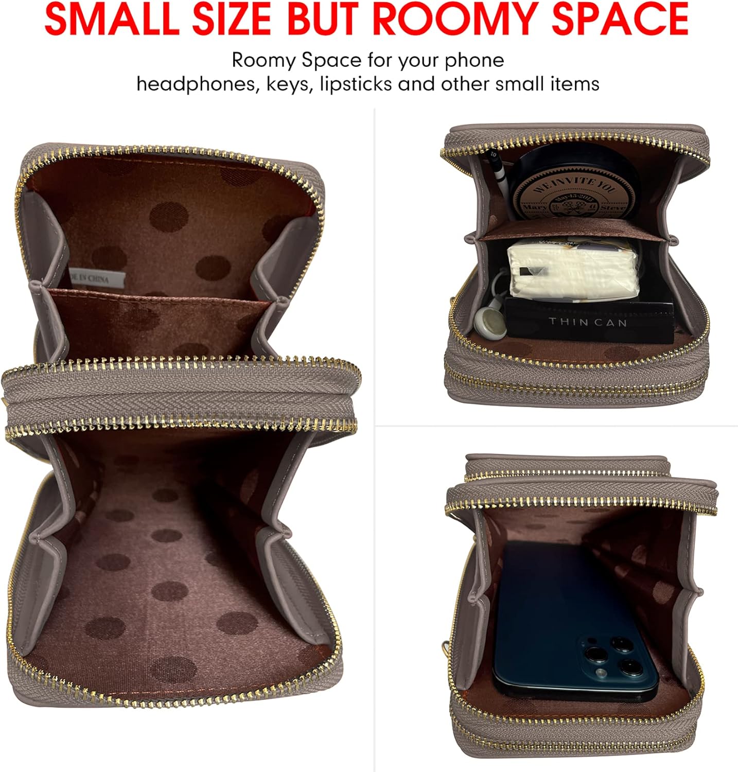 The elegant bag is well designed for both the cell phone bag and for the purposes of the fashion body bag. The main zip pockets are compatible with the phone screen of up to 6.7 inches, including the normal telephone box. It can fit, but not limited to smartphones (AT&T, T-Mobile, Sprint, Verizon), such as Apple iPhone 11, iPhone 11 Pro Max, iPhone XS Max XR 10 7 Plus 8 Plus 6 6s Plus; Samsung Galaxy S10 S10 Plus S9 S9 Plus S8 Plus S7 Edge Galaxy A10E A20 A7 Note 10 Plus 9 7 Edge Gear, LG K20 Stylo 4 Plus; Google Pixel 3a 4; Moto G7, OnePlus 7T, etc. Only if the special size phone box were greater than 3.9 “(l) x 7” (h), the phone bag could not fit. Meanwhile, the small Crossbody bag is spacious and convenient with multiple zipper compartments, it can contain credit identifications and cards, money, telephones without vulture and still have space for makeup and daily things, such as passports, boarding pass, license of Driving, energy, bank energy, keys, sunglasses, pens, tissues, mirror, lipsticks, disinfectant of small hands, body lotion, etc.