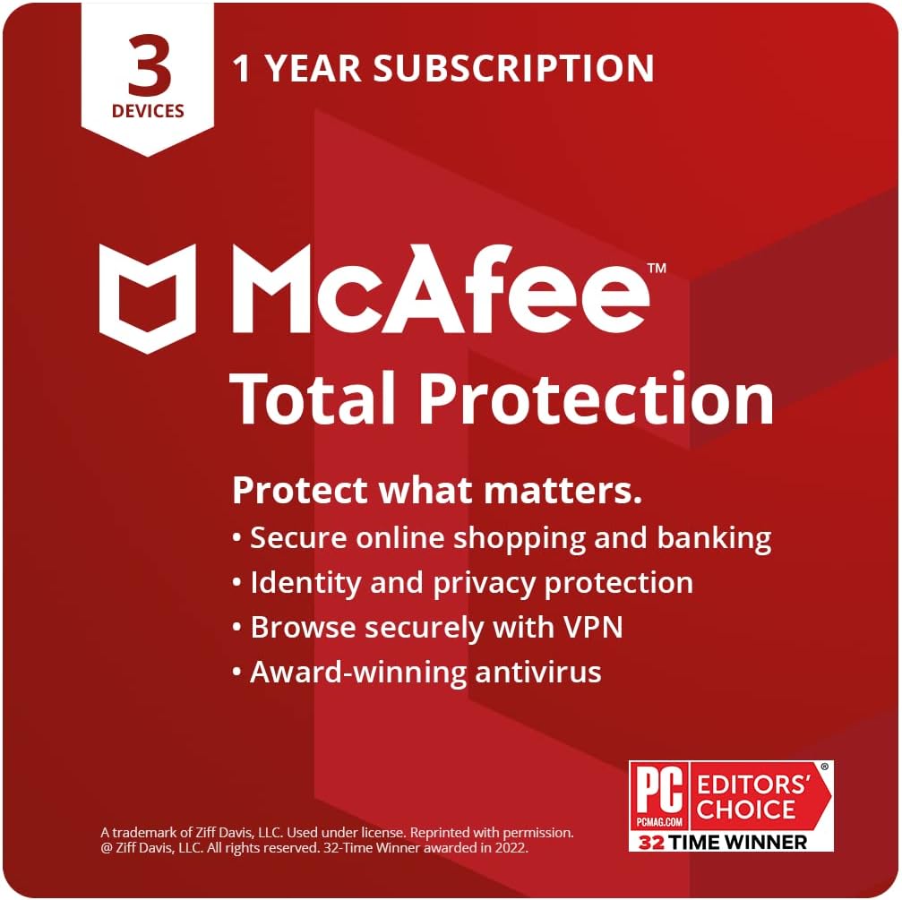 McAfee Total Protection for 3 devices is all-in-one online protection: award-winning antivirus and online services to protect your security, identity, and privacy so you can live your life online with freedom and confidence.