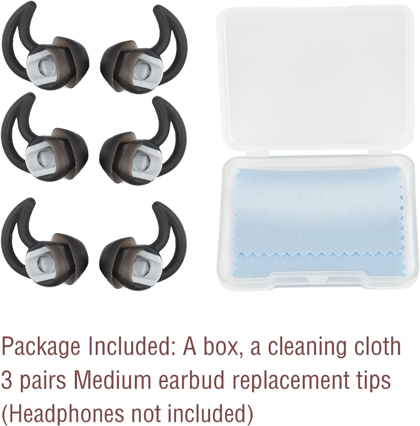 5. The package is included: a box, a cleaning cloth, 3 pairs of medium headphones replacement tips