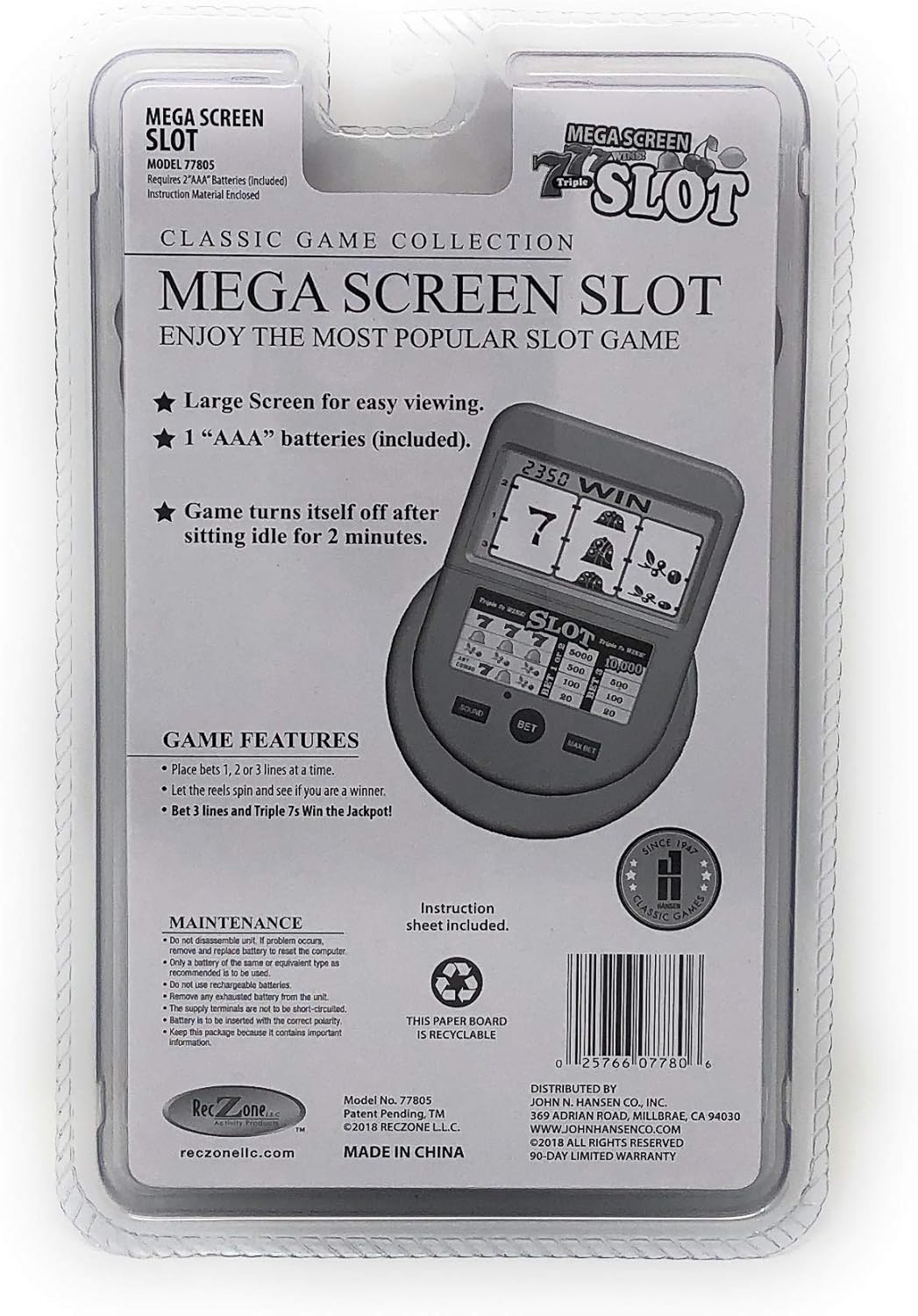 Game Characteristics: Place bets 1, 2 or 3 lines at the same time. Leave the sp8i8n reels and see if he is a winner. I bet to 3 lines and Triple 7 won the fat award! The unit does not have a later light for the night game. General dimensions of the unit; 6.00 x 4.25 x 0.75 inches (2) AAA batteries are included