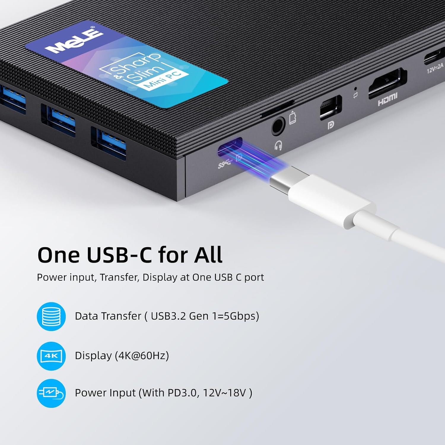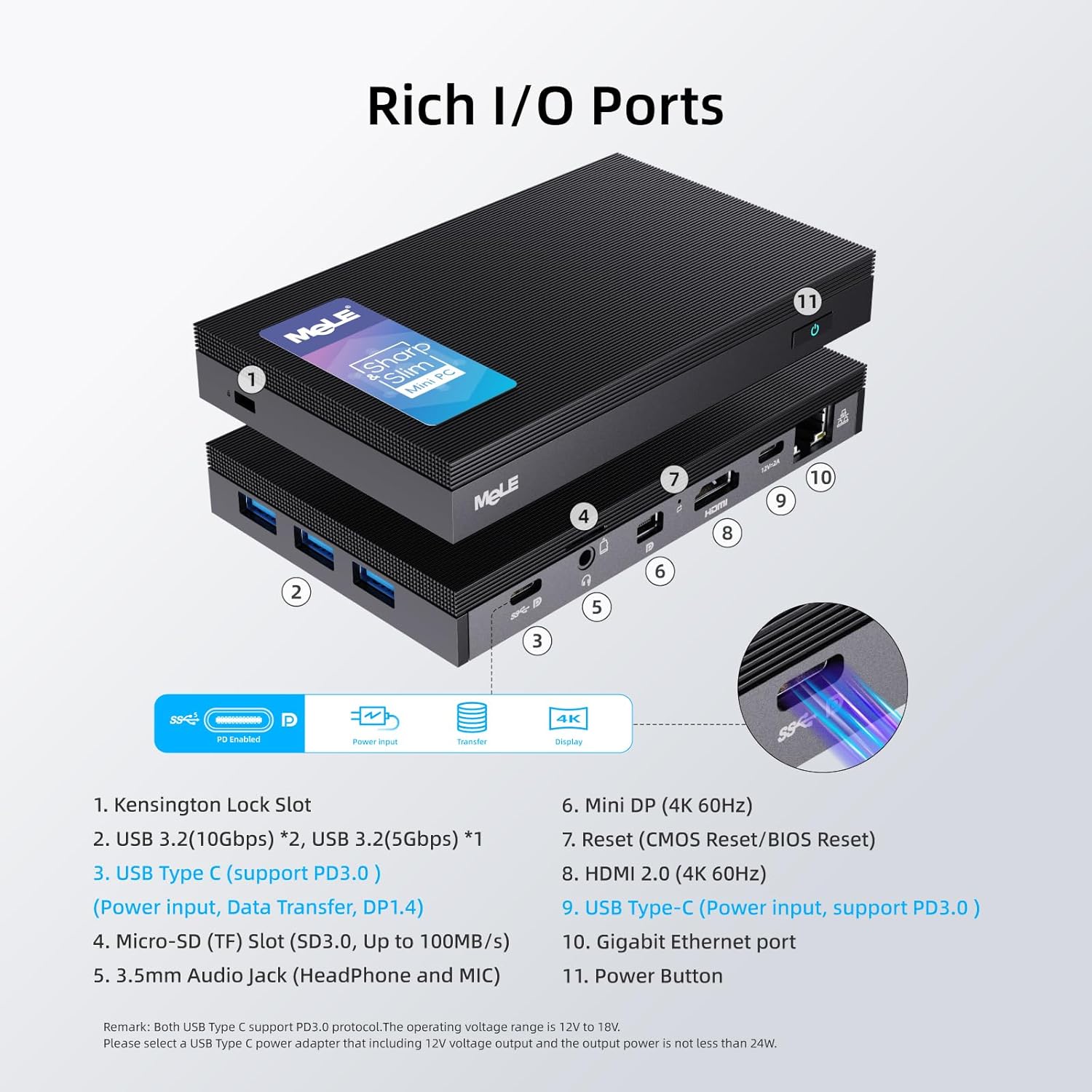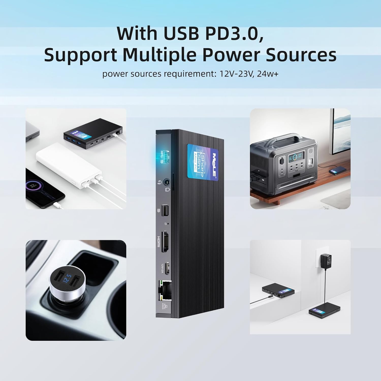 PD Enabled Charging Port: The left USB Type C port of this small PC adopts PD technology, supports multiple PD power stations, makes it easy for you to compute while traveling, outdoors, in the car, etc. (Make sure the power amount is more than 24W to enable the computer to start.)