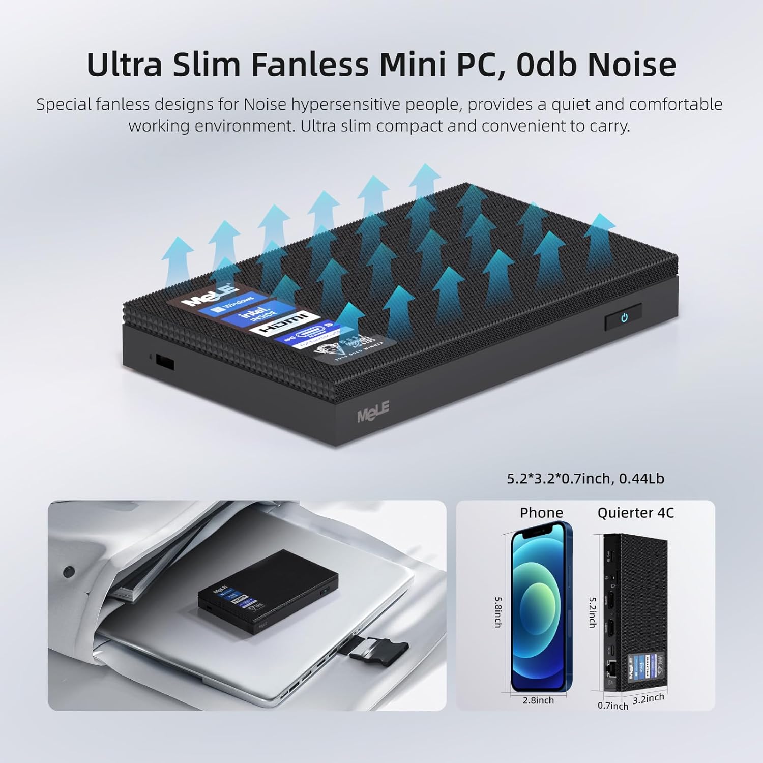 【Fanless Design & Ultra Small Size】The mini desktop computer adopted 0dB noise fanless design which offers a quiet and comfortable experience. Quieter4C small form factor PC in size of only 5.2×3.2×0.7 inch and 0.44Lb. This silent PC can easily be taken along for a business trip. Space-saving design comes with a VESA mount, can be mounted on the back of a TV/monitor. To improve the order of the office desk space. Good choice for light office work, conferences, web browsing, online education, etc.