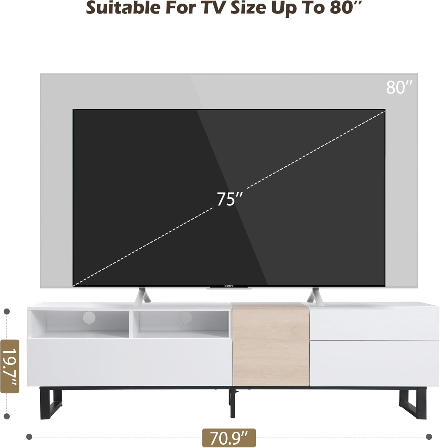 The solid structure with elegant metal legs highlights an impressive contrast between the two materials, which is further improved with the warm wood tone against the white color of this TV support. This universal TV support includes a detailed user manual and labeled parts for easy installation. TV support dimensions: 70.9 “L x 15” W x 19.7 “H.