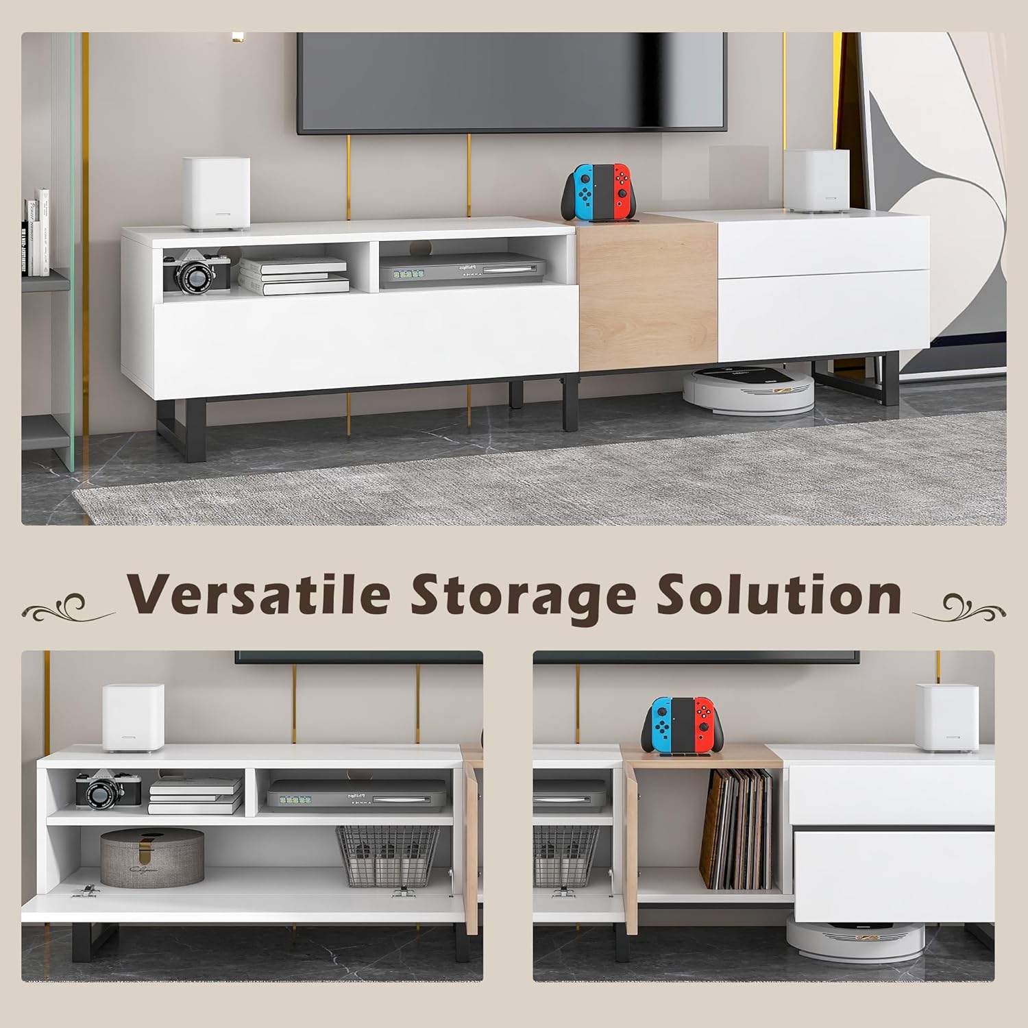 Simple and modern design with clean lines, this merax TV support is well proportioned with 2 or solid -shaped legs, 2 central support feet and functional storage spaces, strong enough to store multiple electronic equipment and perfect for any contemporary space.