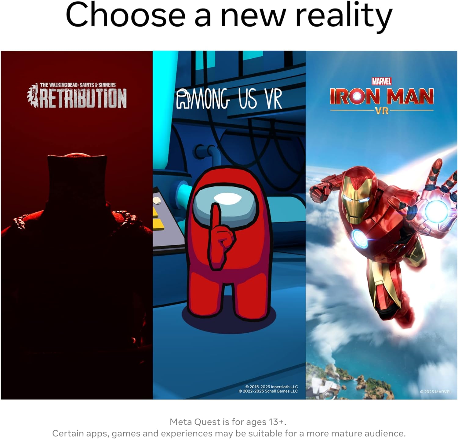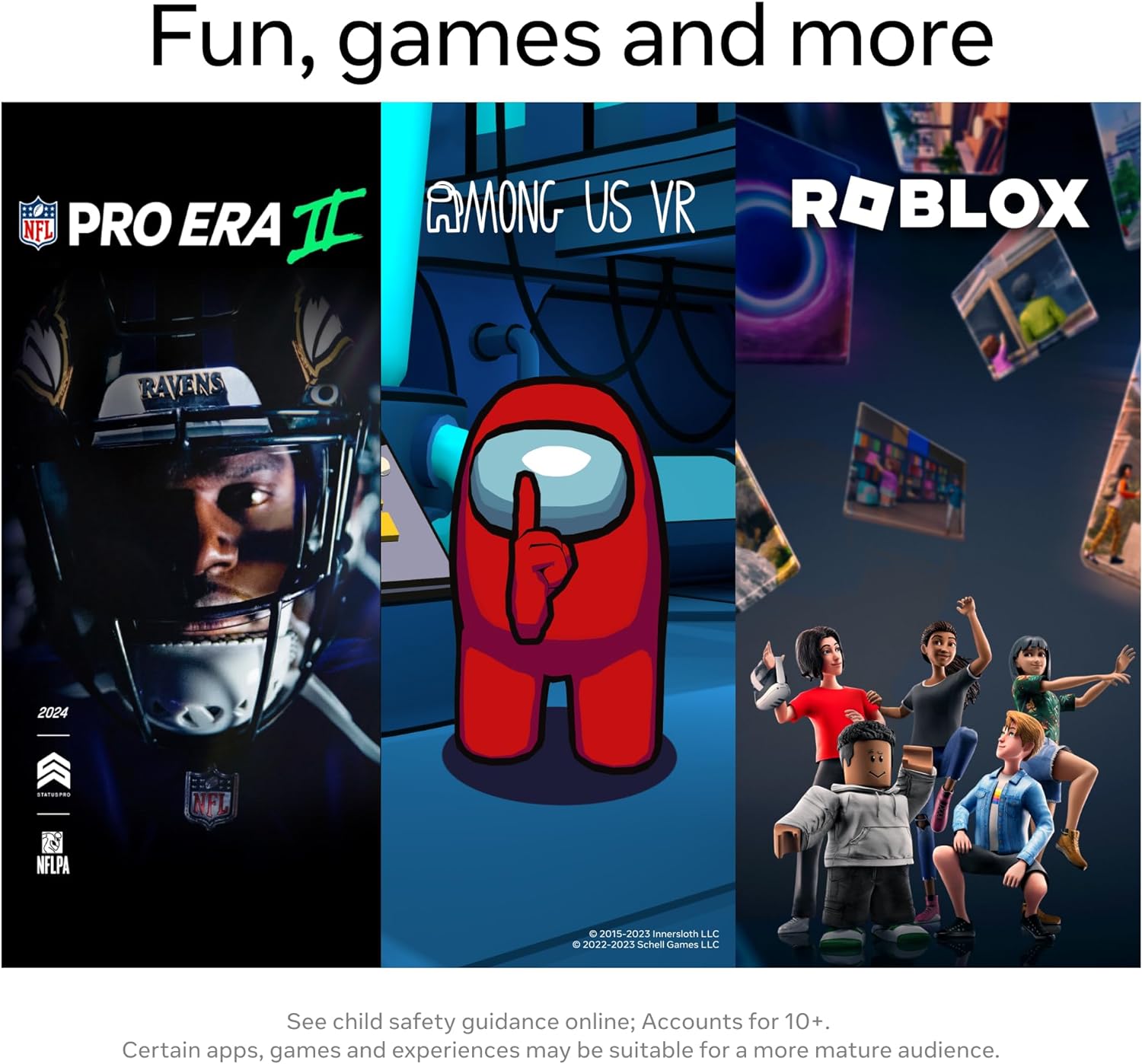 Meta Quest 2 is the all-in-one system that truly gives you the freedom to explore in VR. Simply put on your headphones and enter fully immersive worlds that challenge the imagination. A built-in battery, fast processor, and immersive graphics keep your experience smooth and fluid, while 3D positional audio, hand tracking, and easy-to-use controllers make virtual worlds feel real. Meet, play and build communities with people from all over the world. Start an epic new adventure, team up with friends, or add more fun to your workout routine. Invite others to your VR experience by casting to a compatible TV or display as it unfolds. Consult the online child safety guide; Accounts for 10+.