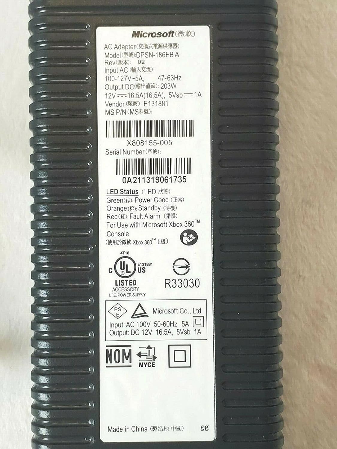 Microsoft Official Xbox 360 203W AC Power Supply Adapter