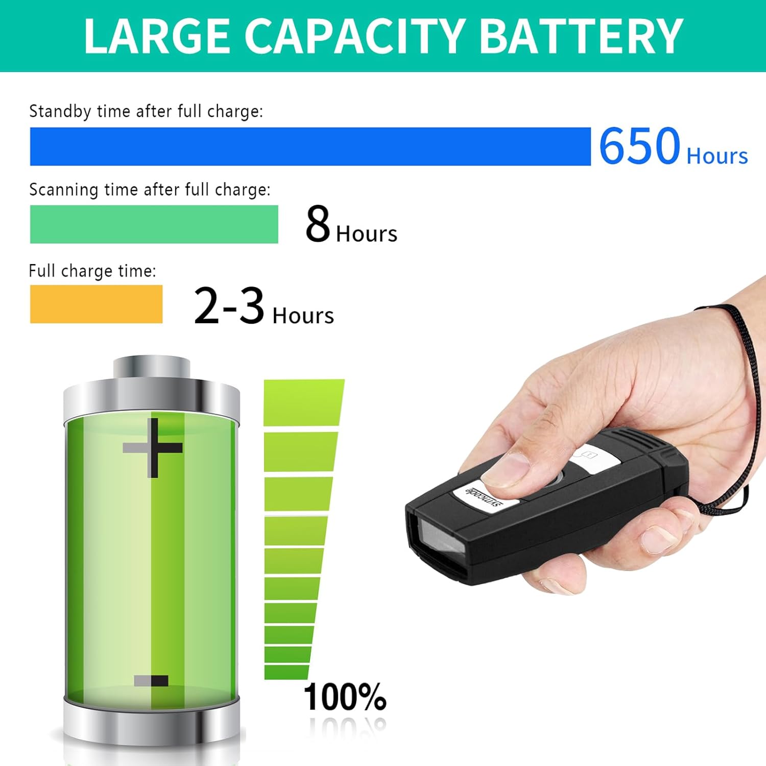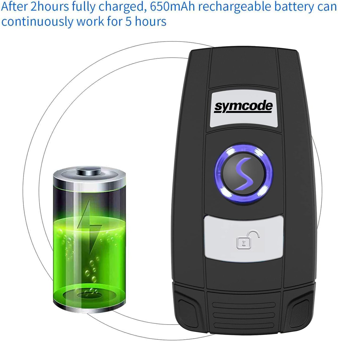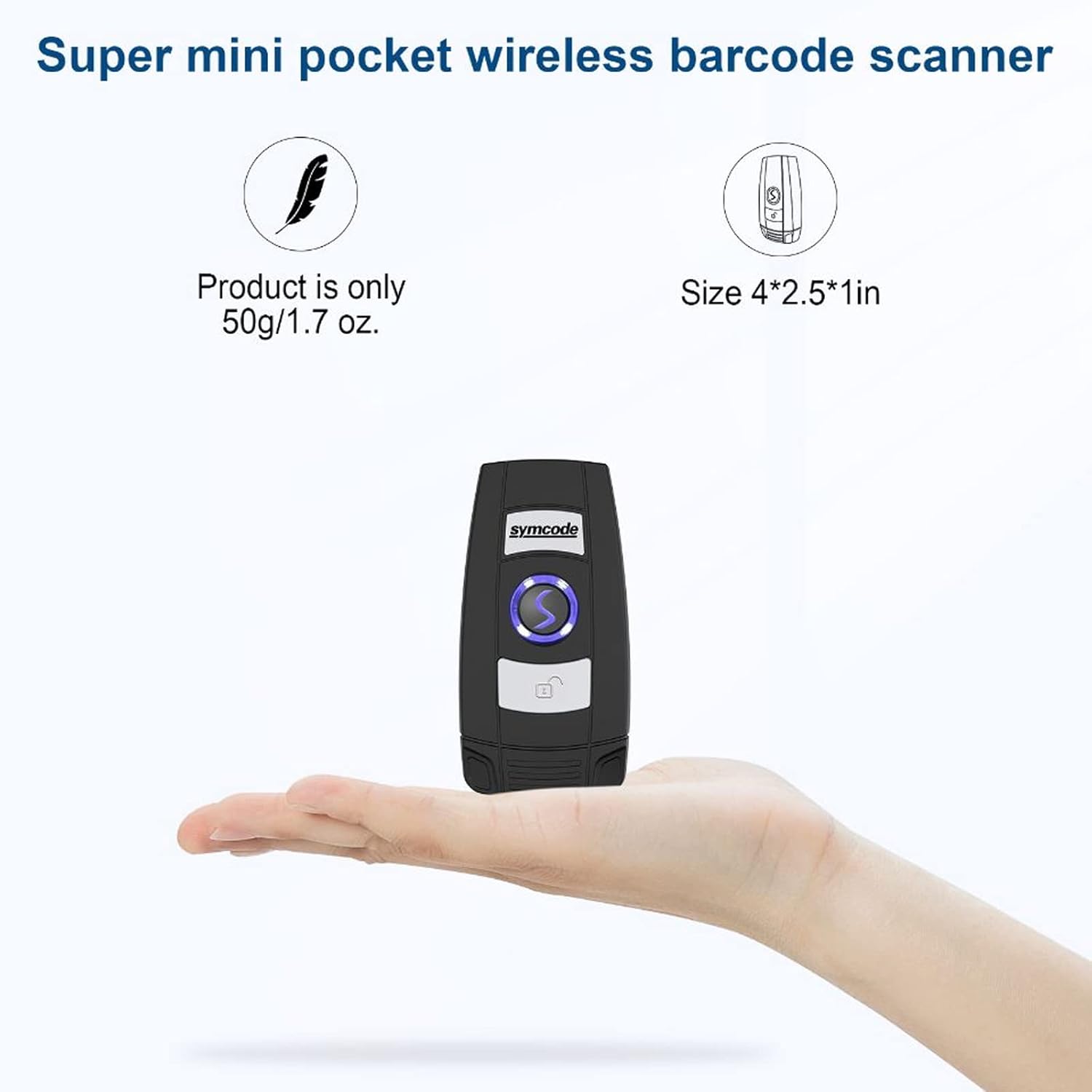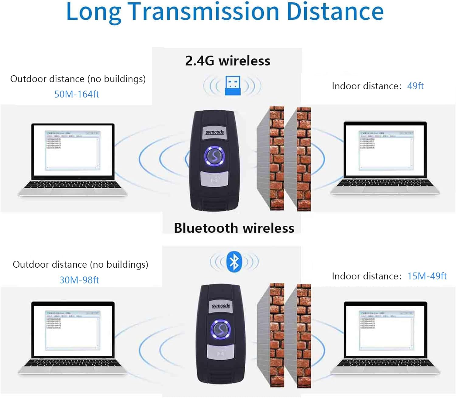 [3 in 1 connection mode:] It can change between 2.4G wireless and Bluetooth and USB with three more convenient connection mode types. Also Bluetooth symcode Barcode Scanner offers a transmission distance without barrier of up to 30 m/98 feet under the wireless mode of 2.4g, up to 50 m/164 feet, a distance without barrier in Bluetooth mode.