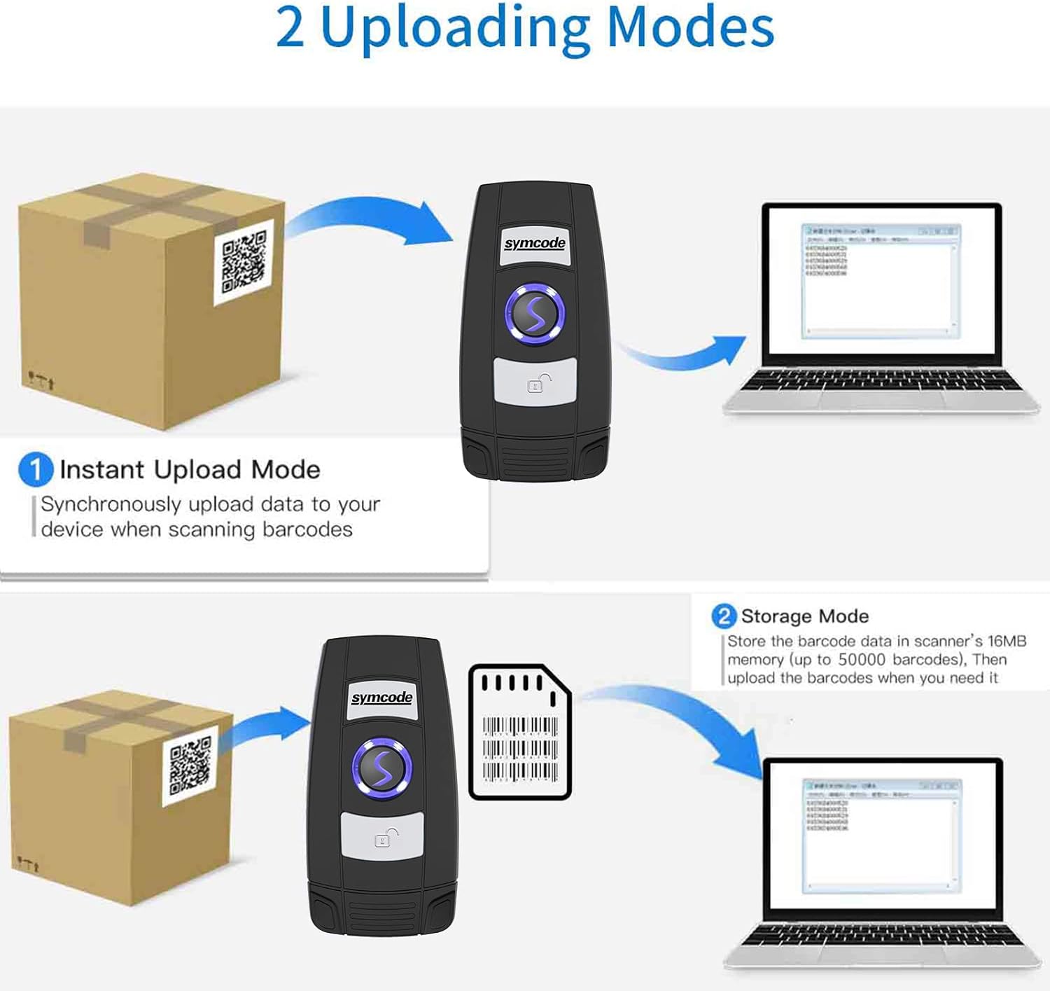 [Two modes of data transfer]: Instant transfer mode/storage mode. In off -line storage mode. The barcode scanner can automatically store barcode data on the device. Load data to your bulk device when necessary. The barcode data can be stored up to 150,000 barcodes