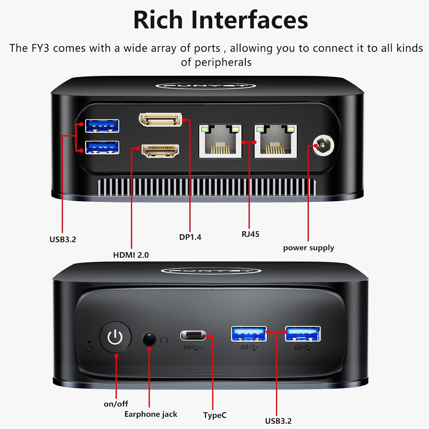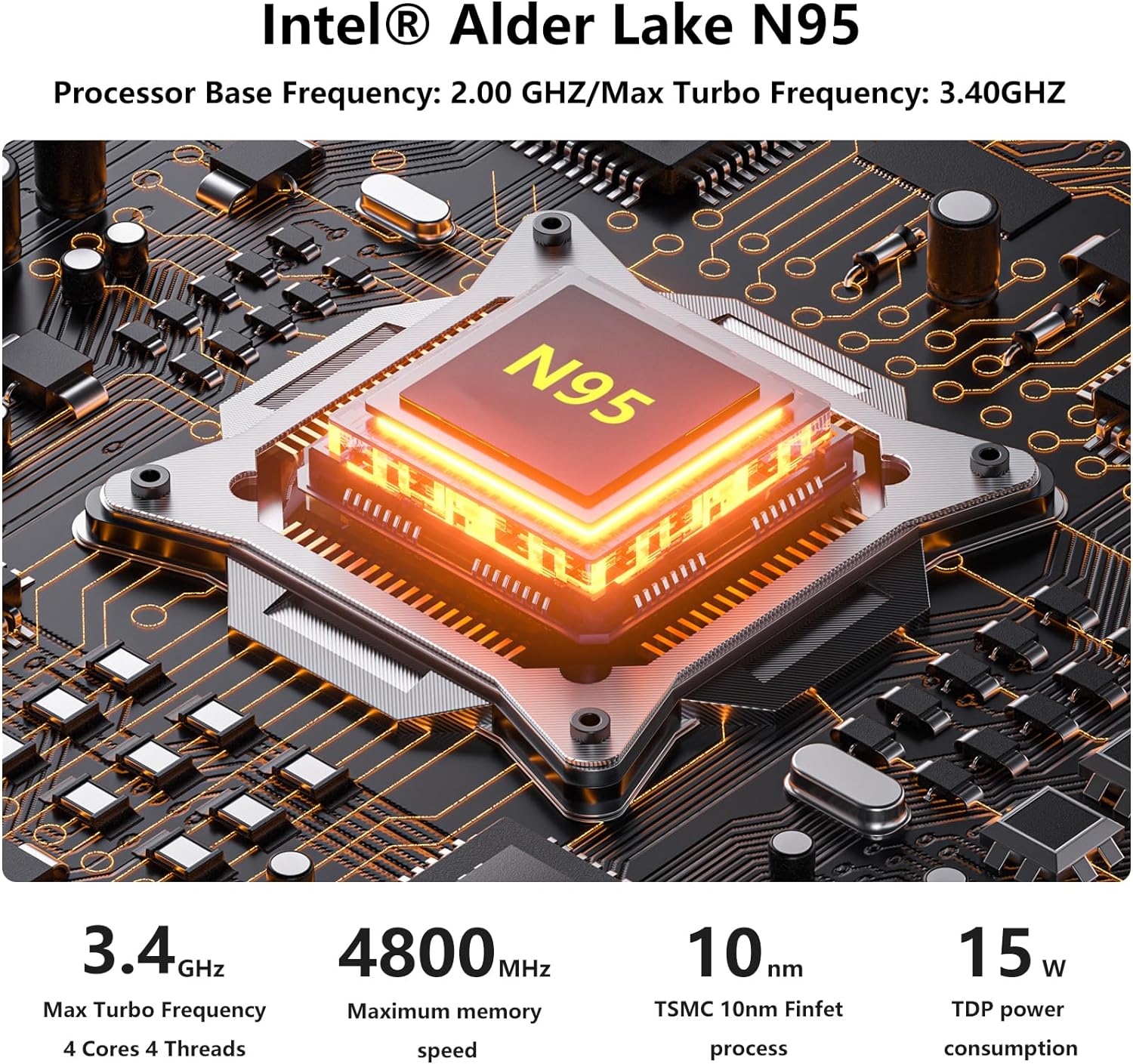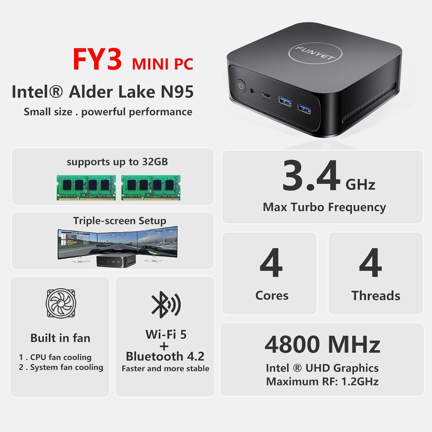 【🚀 Powerful Performance】FUNYET mini PC features an Intel Alder Lake N95 processor with 4 cores and 4 threads, delivering powerful single or multi-threaded performance up to 3.4GHz. Ideal for demanding workloads, gaming, and multimedia tasks.