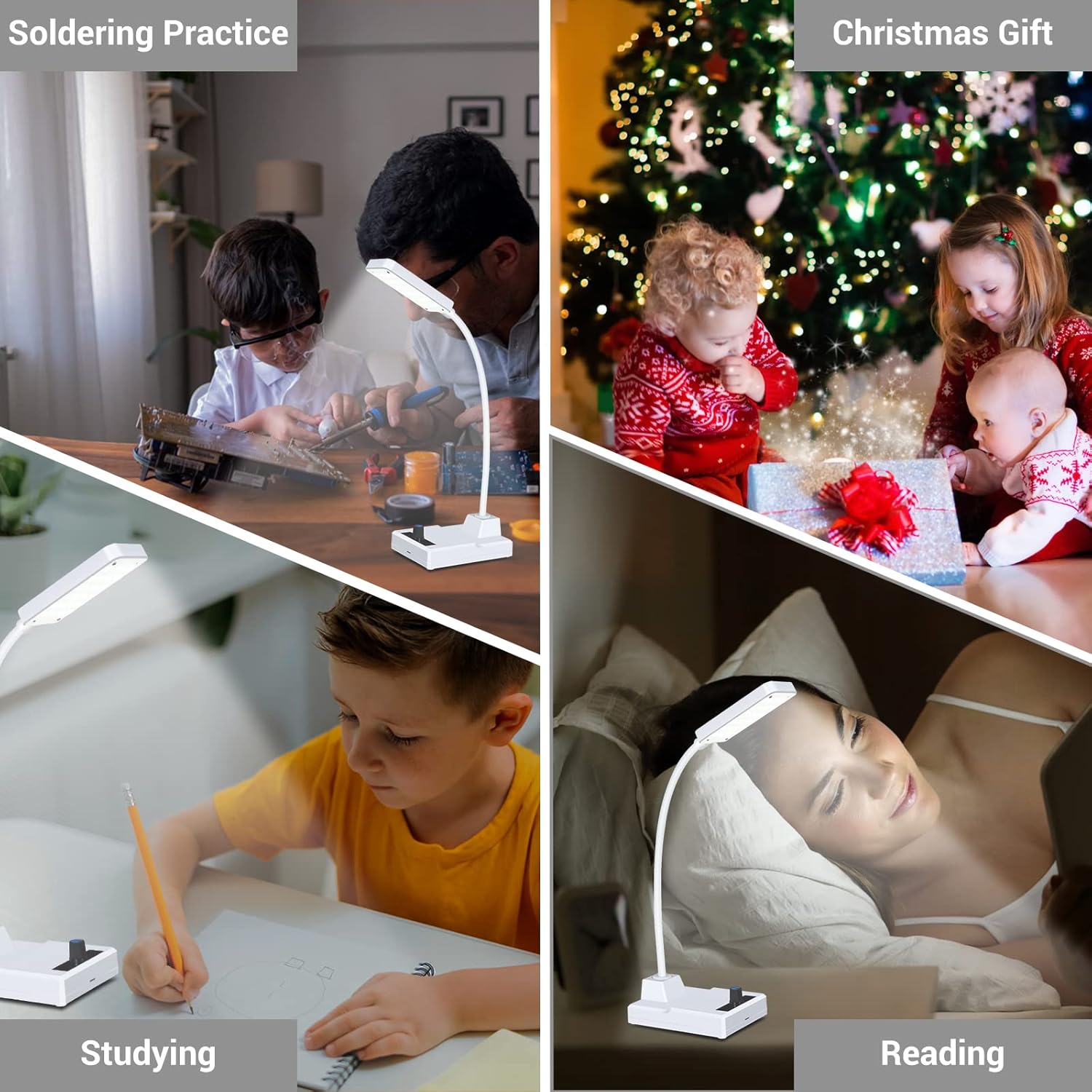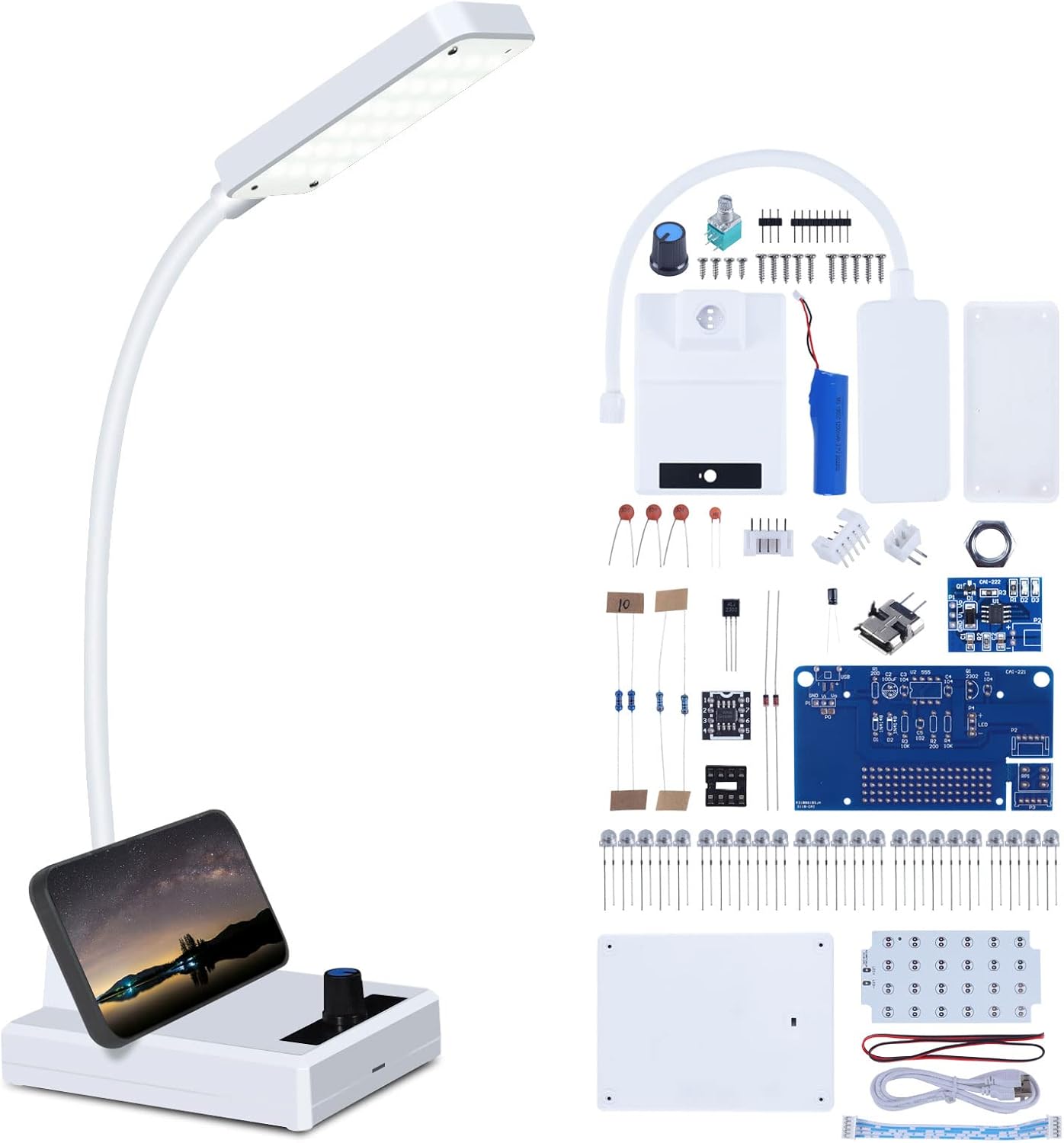 Functions and Features: This LED desk light is bright enough at night, the brightness can be adjusted via the knob. Equipped with a flexible gooseneck, the desk lamps allow you to point the light in any direction. At the same time, you can also use it as a mobile phone holder. The textured appearance makes this soldering project kit an irresistible gift for any occasion.