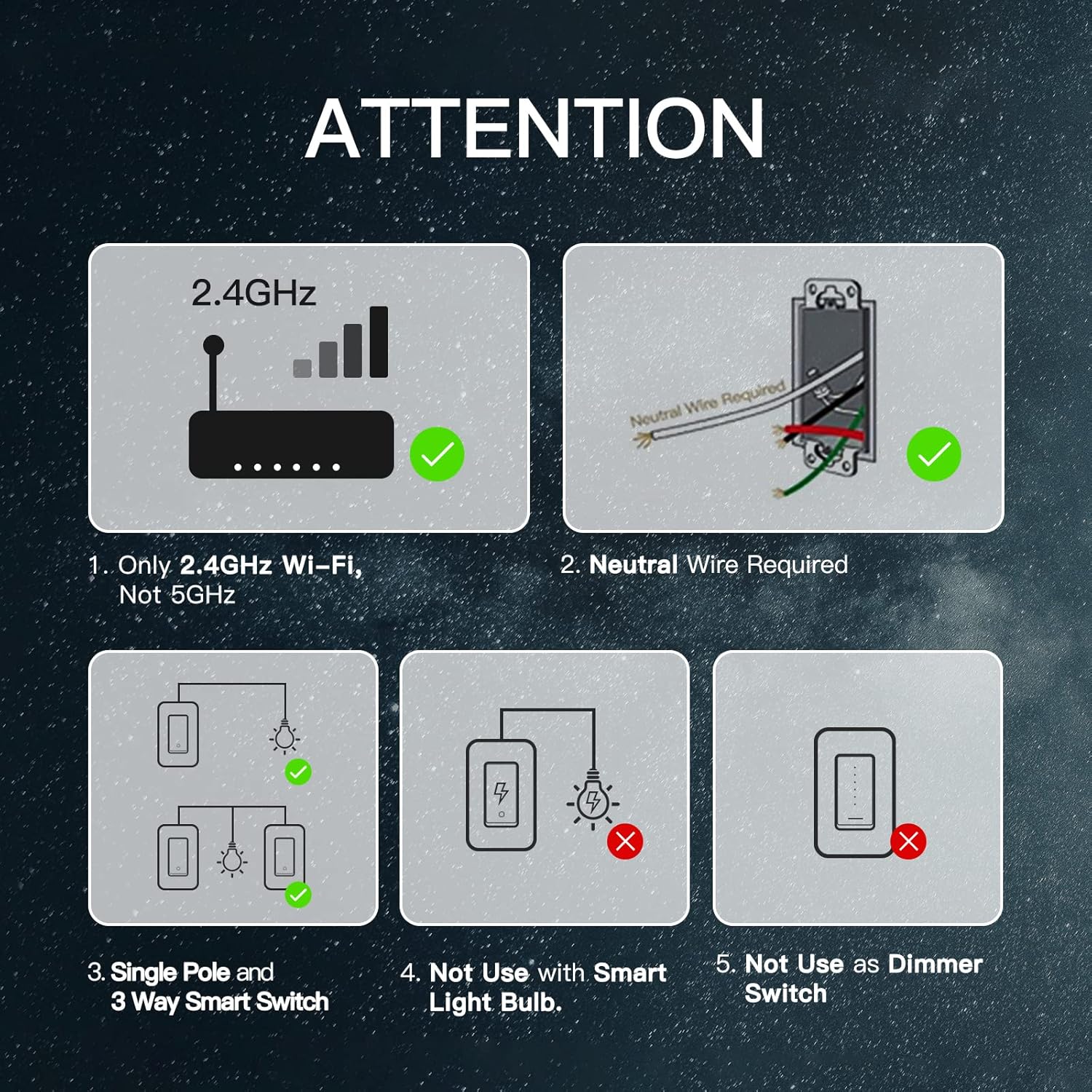 【Attention】Neutral wire required; Only support 2.4GHz WiFi; Not used with smart bulbs; Not work as a dimmer switch;