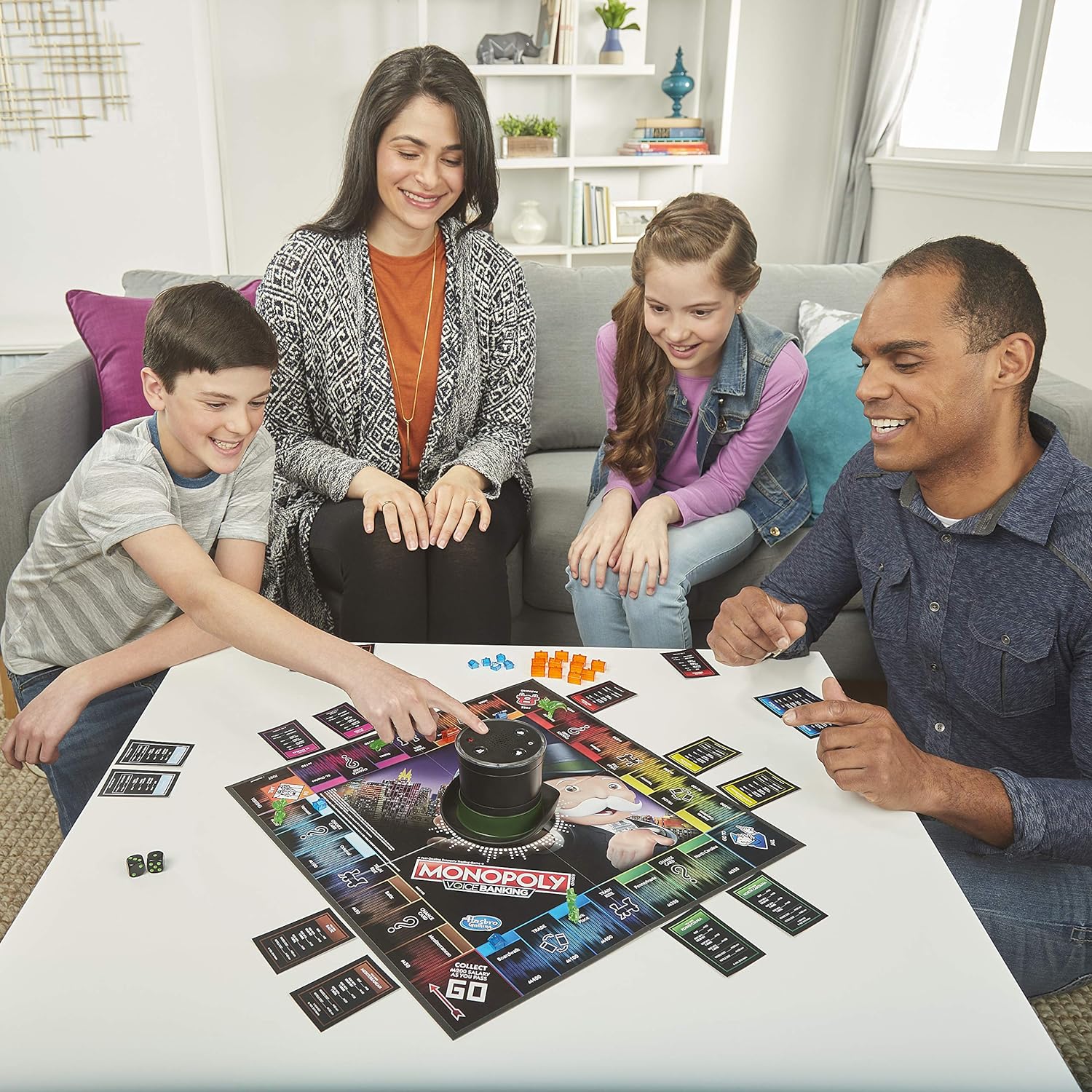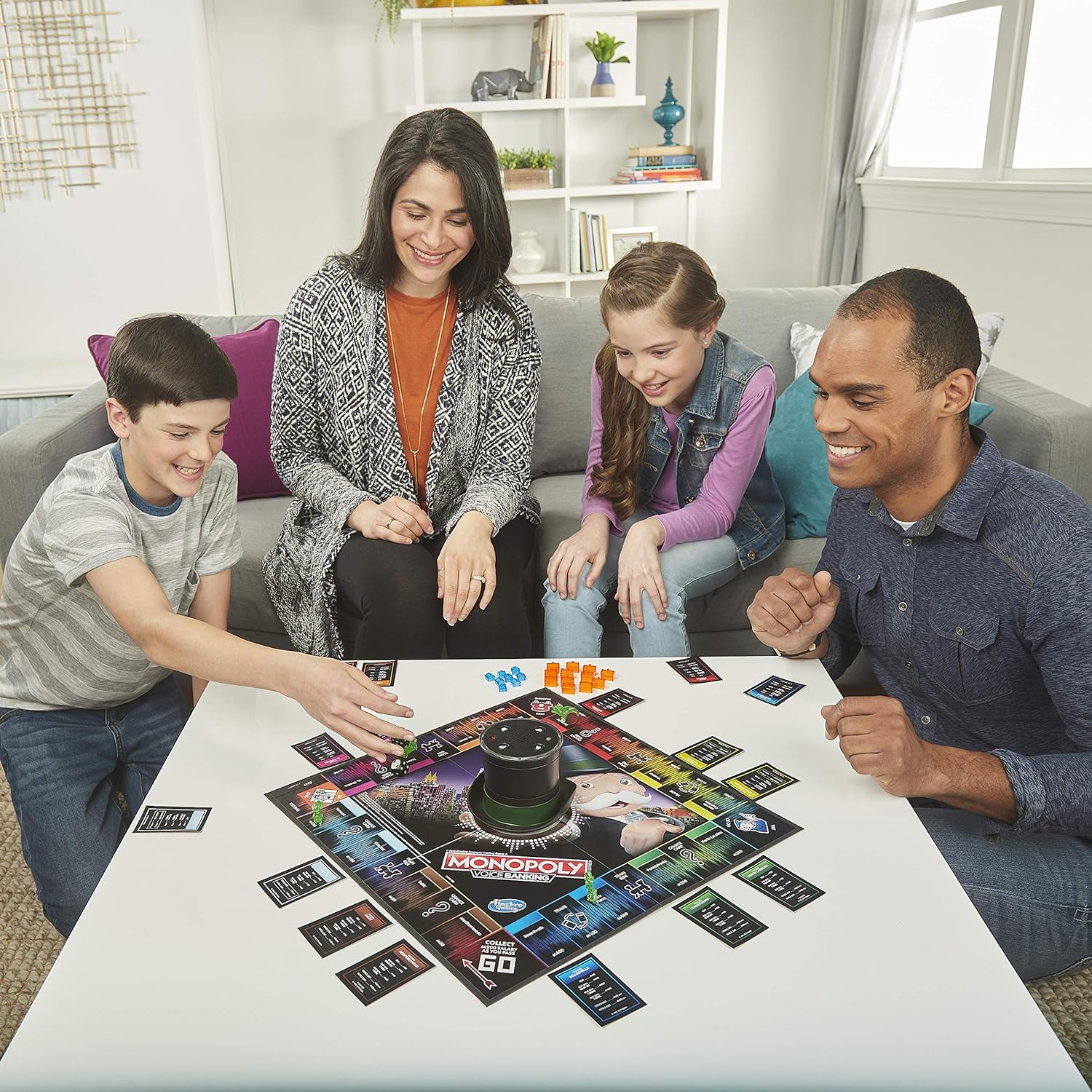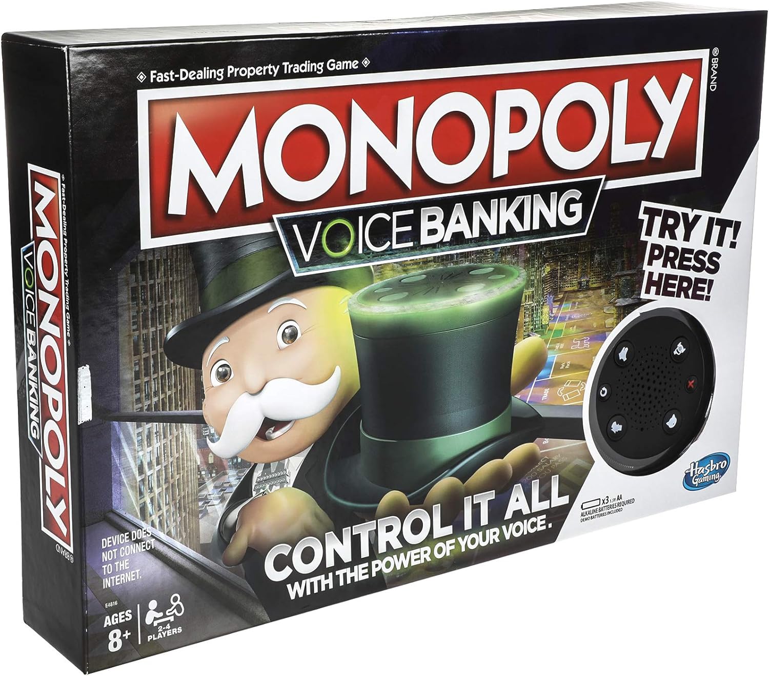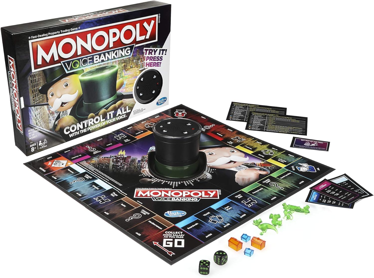 The Monopoly voice banking game features lights and sounds, and comes with an interactive Mr. Monopoly banking unit. Monopoly's iconic top hat is voice-activated and Mr. Monopoly's personality really shines as he handles all the transactions. He controls the players' money and property so there is no need to think about cash or cards. He talks to Mr. Monopoly and he answers. For example, he presses his TOKEN button and says “buy St. James house”. Mr. Monopoly will track the transaction, keeping the game moving. With the Monopoly voice game, players travel around the board with the goal of being the person with the most money and the highest property value to win!