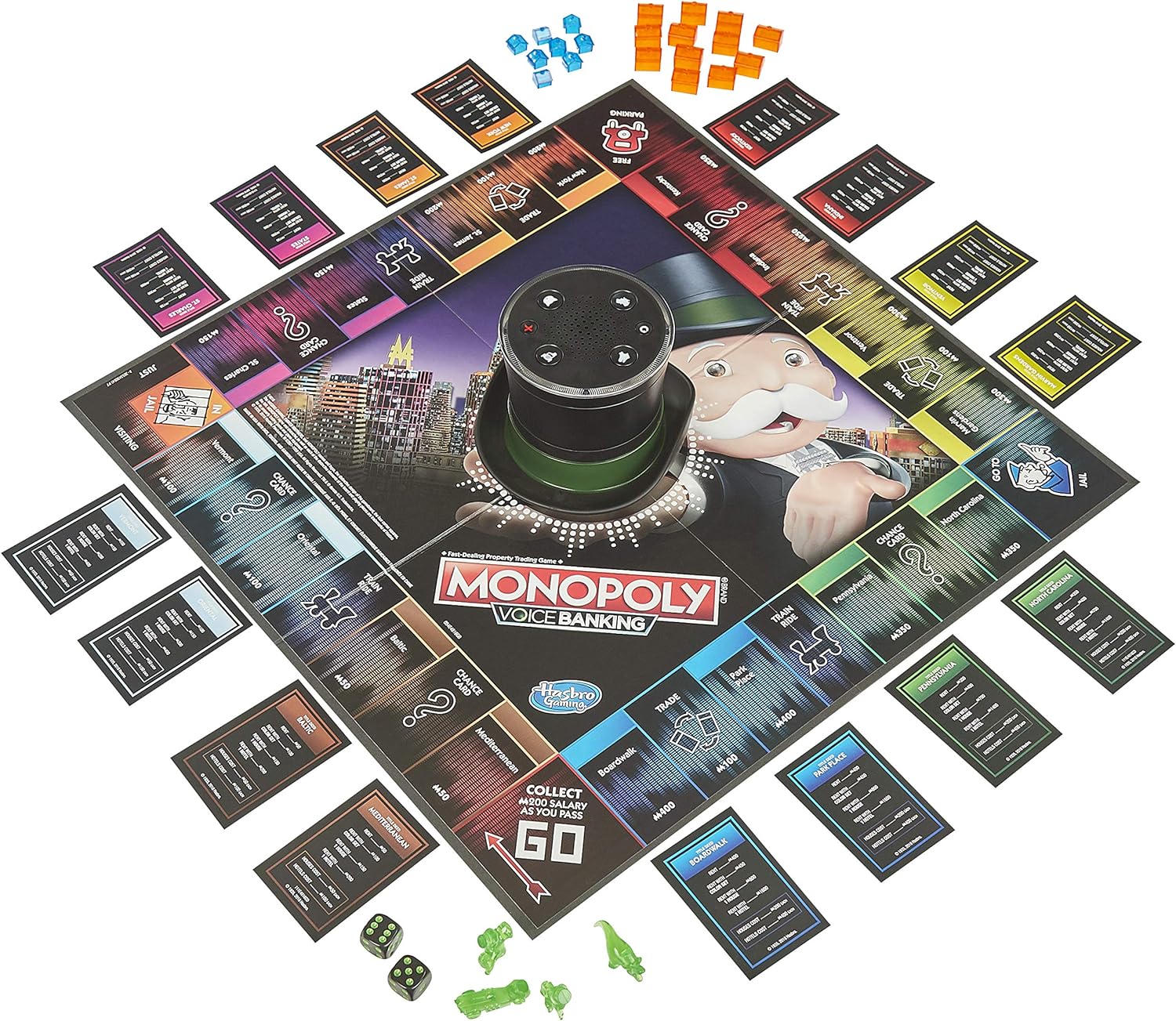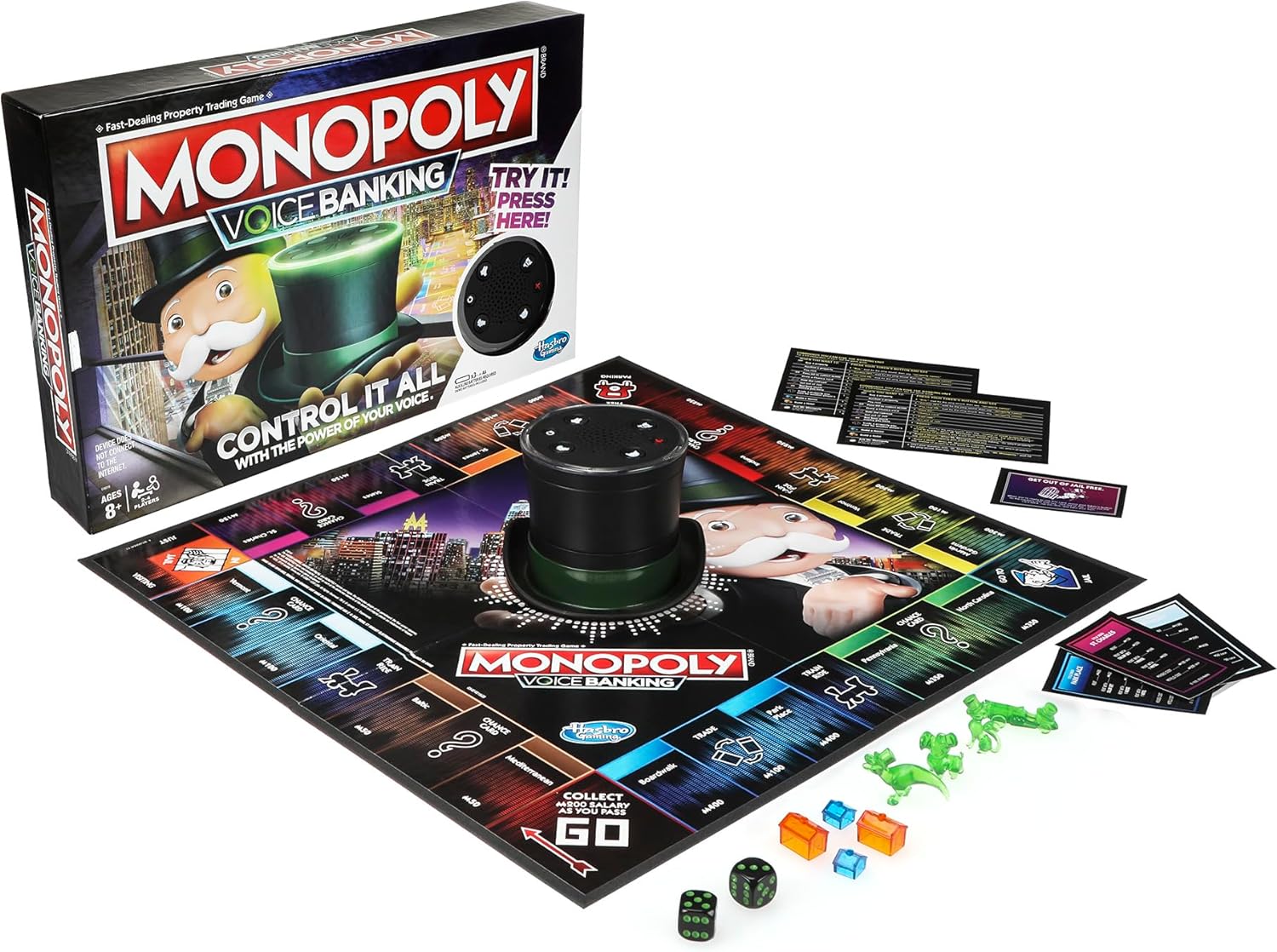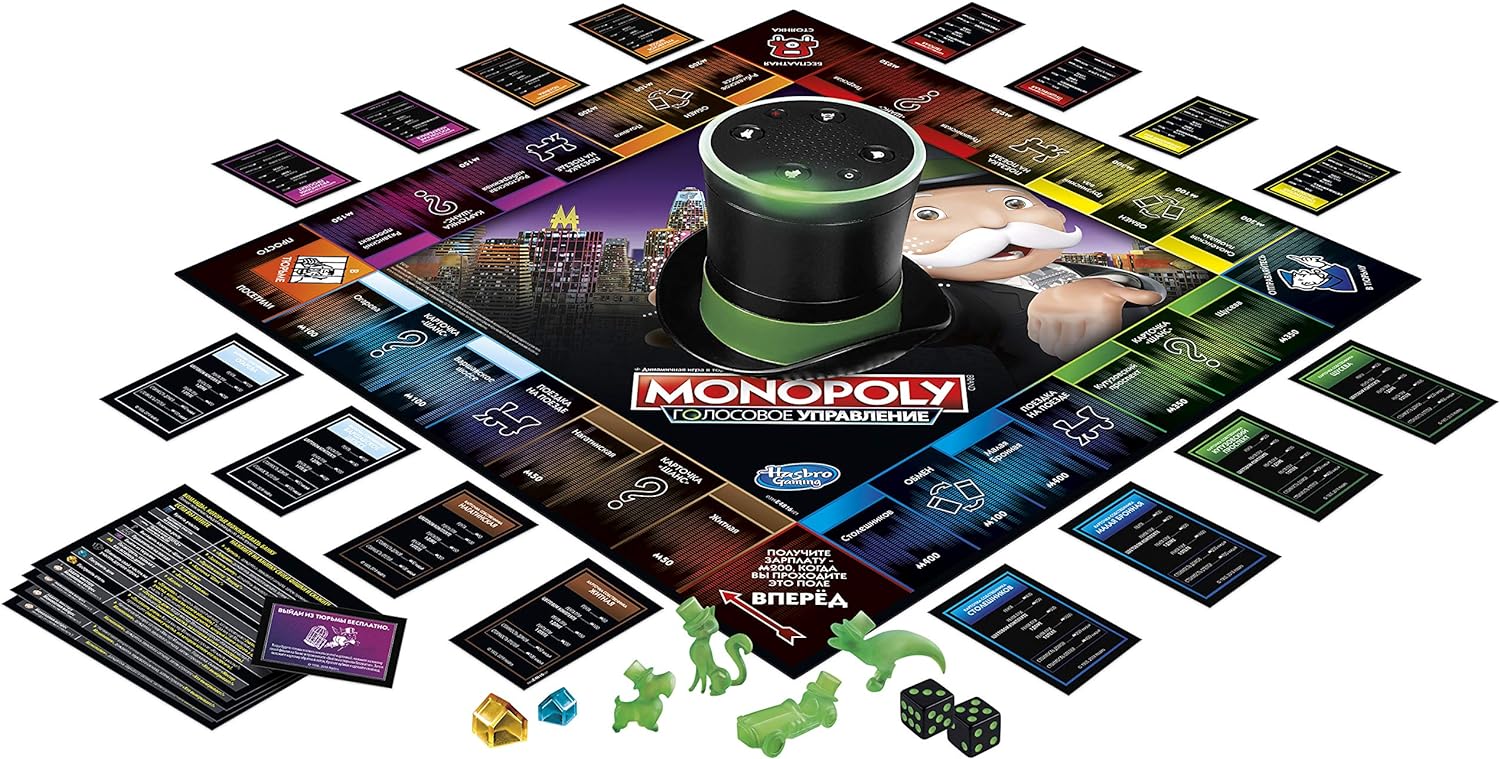 Monopoly meets voice recognition: In this electronic Monopoly voice banking game, Mr. Monopoly is the banker and manages players' money through his top hat.
