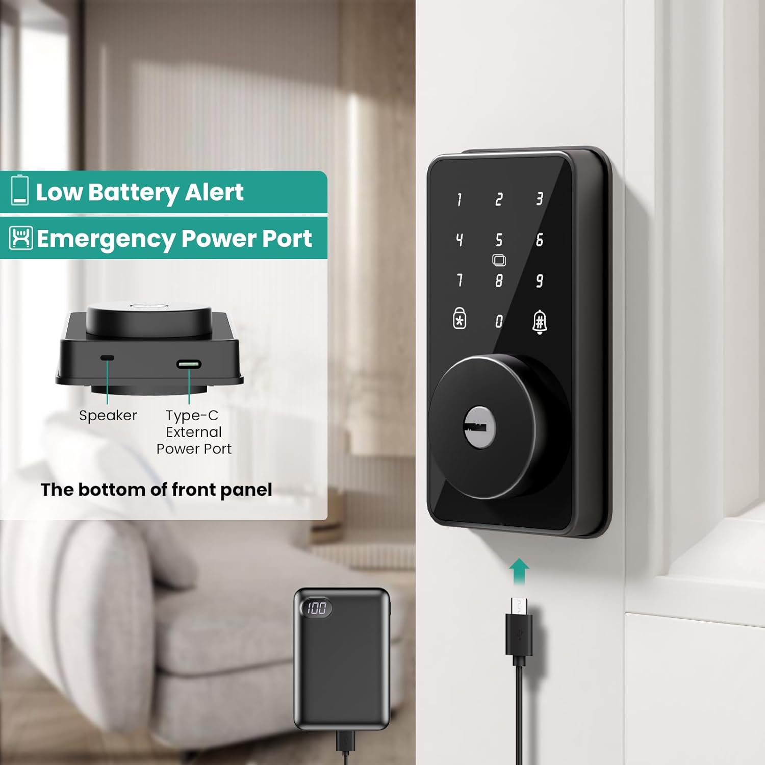 [Safer & Smart Door Lock] The deadbolt will lock automatically after you leave. Auto lock time can be set in the app from 1 to 180s. Password settings, member management, logs and volume can also be set in the APP. Low battery voice alarm for battery change reminder and emergency power port let you never worry about being locked out due to dead batteries.