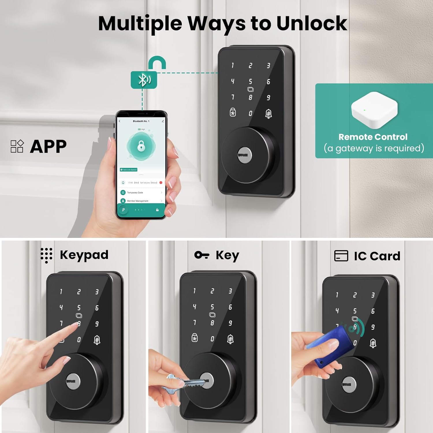 [Multiple Ways to Unlock] Mousetro 4 in 1 Advanced Keyless Entry Door Lock: Passcode + Smartphone App + IC Card + Mechanical Key. Remote unlocking and voice control are also available (Wi-Fi gateway required). Just choose the unlock ways you want.