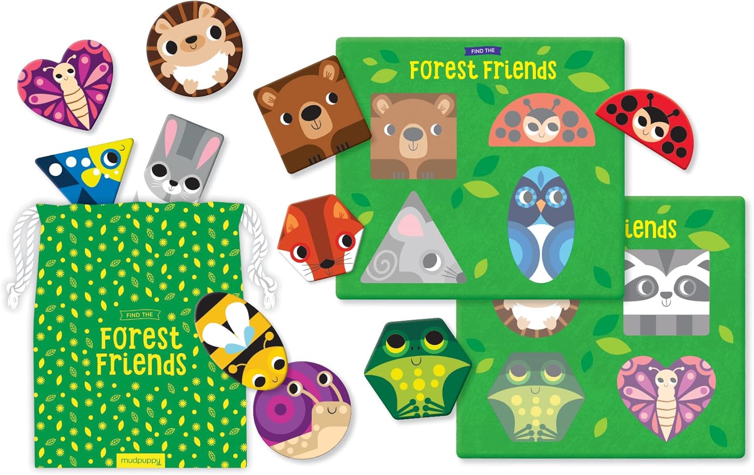Mudpuppy's Find the Forest Friends game is a beginner's bingo game with a twist that includes 16 extra-thick shaped chips, 4 game boards, and a cloth bag for easy cleaning and transport. Children will work on their fine motor and matching skills, as well as shape recognition using their sense of touch to find the shapes of the animals hiding inside the forest (cloth bag).