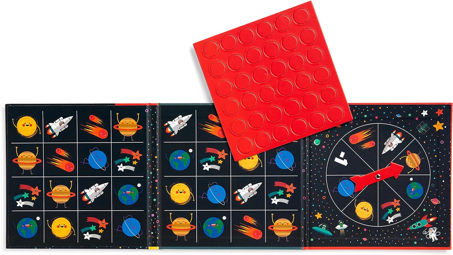 MAGNETIC GAME FOR KIDS: A travel-friendly bingo game featuring illustrations of space, rockets, and planets. Game pieces stick to the magnetic board until you or someone else shouts BINGO!