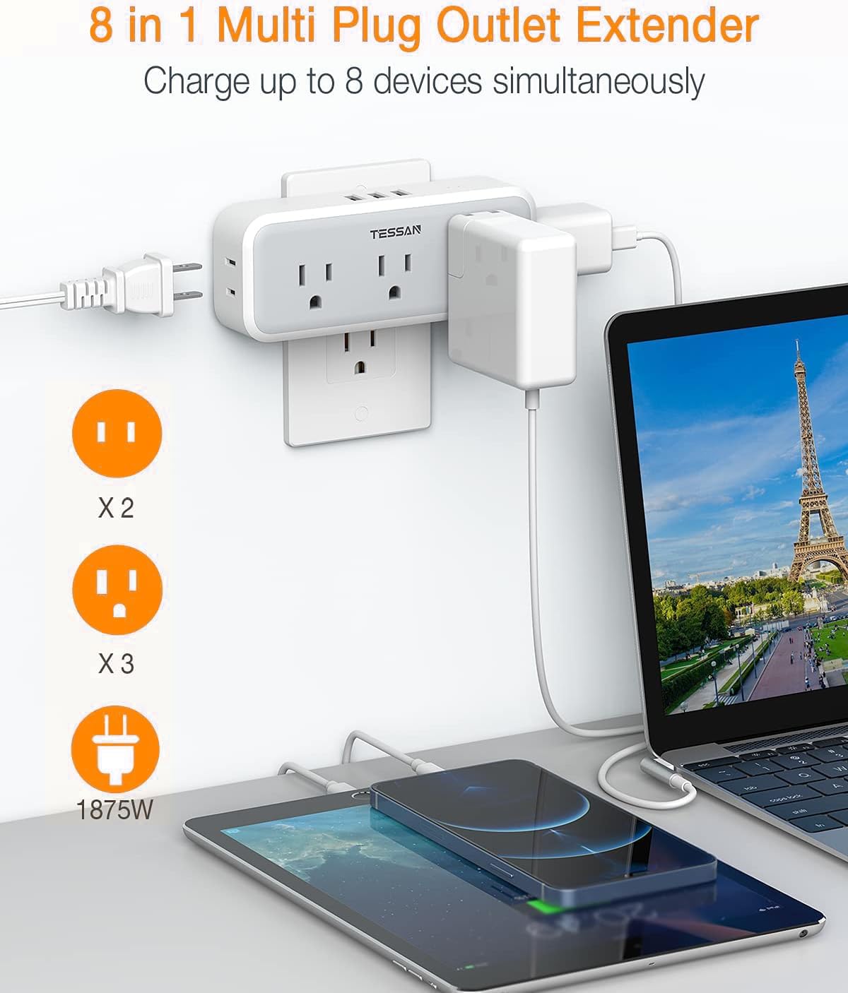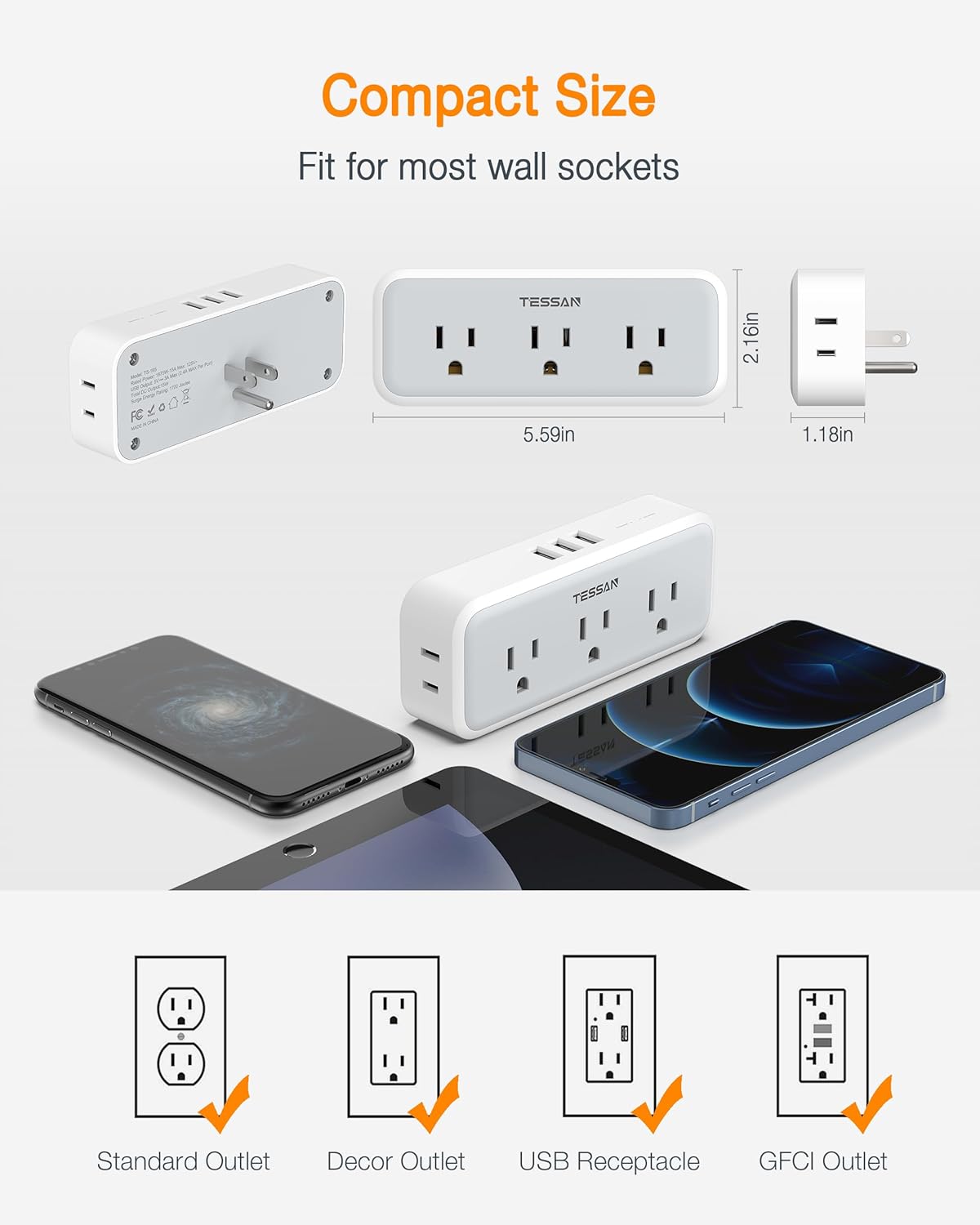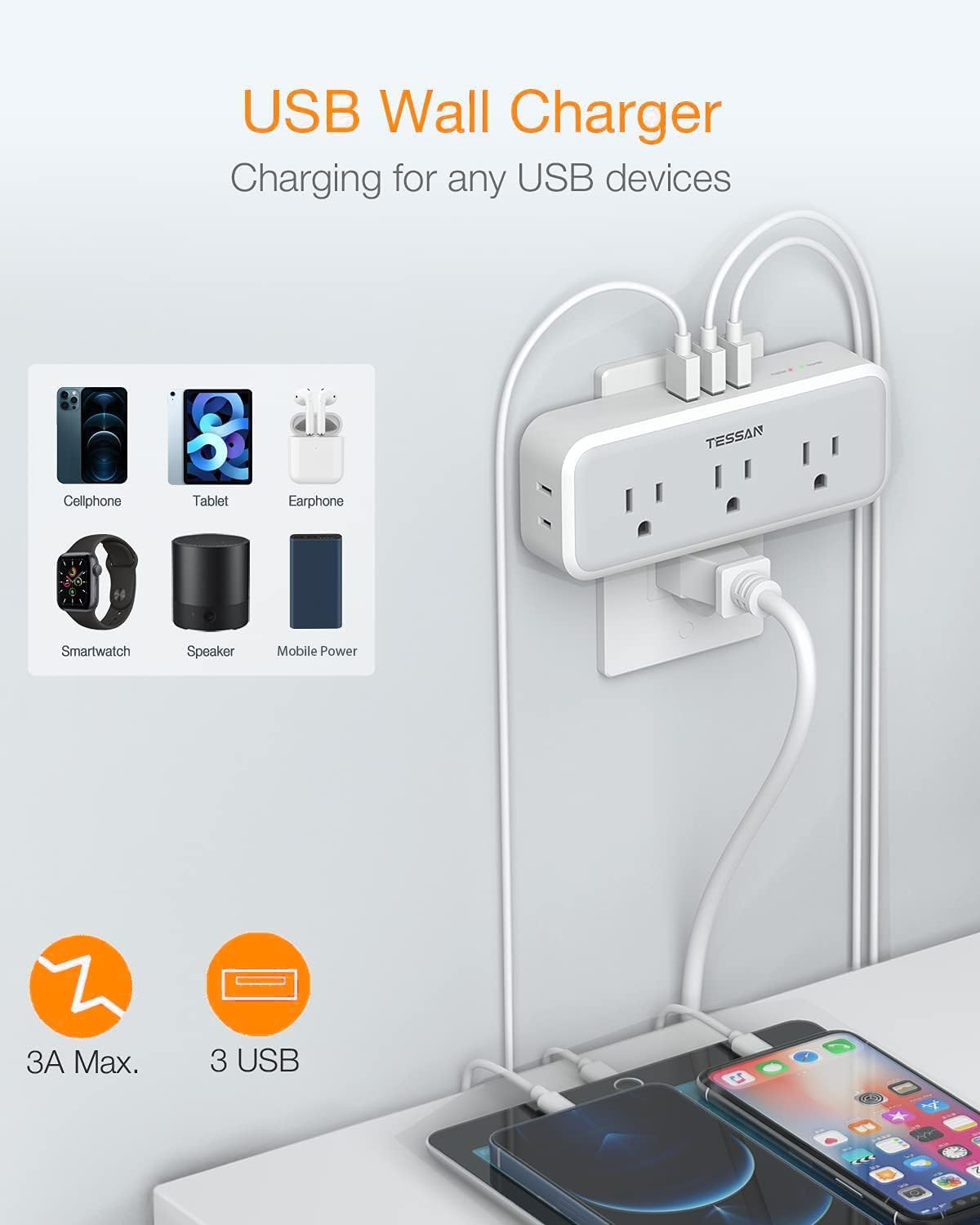 TESSAN wall outlet expander is compact design makes it easy to carry around. You can pack this wall plug expander along with your other travel gears while traveling in the US or Canada.The 15W USB charging is NOT Fast Qualcomm QC3.0, It can meet most USB devices charging needs without an extra power adapter.