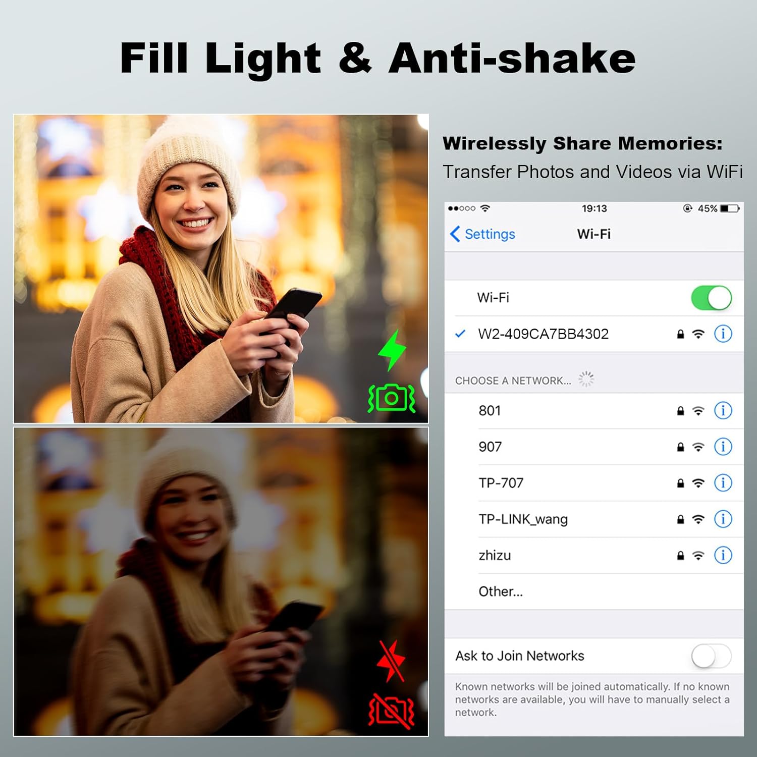 Portable charging stand with auto focus and anti-shake, WiFi and HDMI