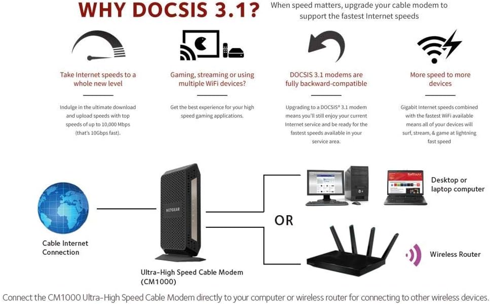 The Modem CM1000 Ultra-High Speed of Netgear CM1000 provides a high-speed cable Internet connection with speeds up to 1 Gbps. It is the first cablelabs cablelabs certificate of the industry, 10 times faster than Docsis 3.0. Working with Internet service providers Docsis 3.0 and Docsis 3.1, is the ultra -high speed cable modem ready for today's service plans and updates. Enjoy the Ultra HD video transmission through IP with a 2×2 or 32×8 channel link that gives you the fastest download speeds, even during peak hours. Save up to $ 156 per year* Eliminating the rental rates of Internet service providers. Ideal for faster Internet cable services such as Comcast Xfinity Gigabit, extreme and performance data plans.
