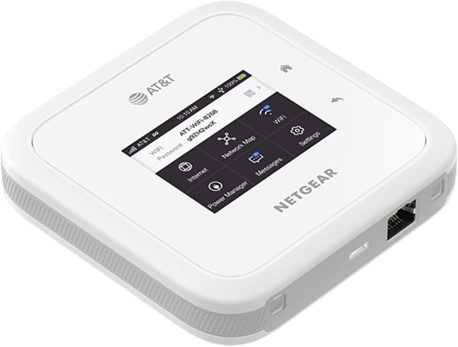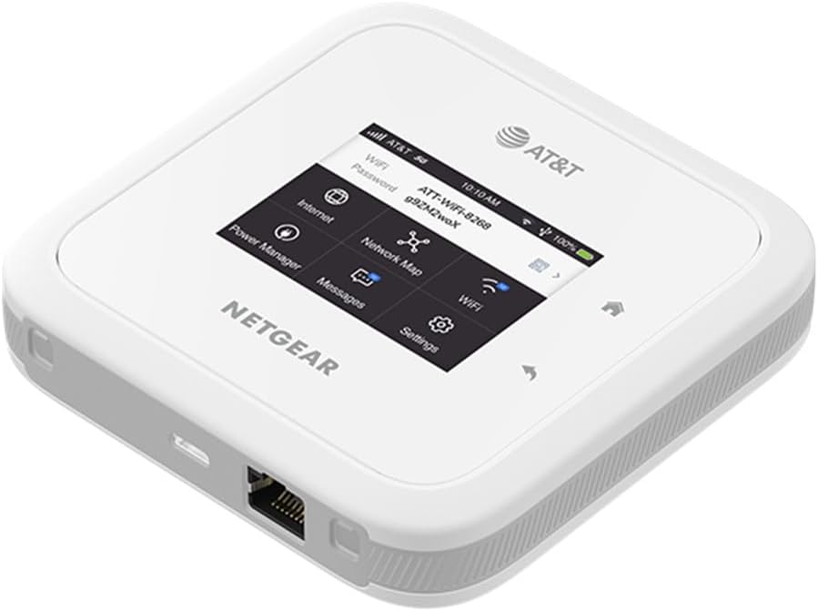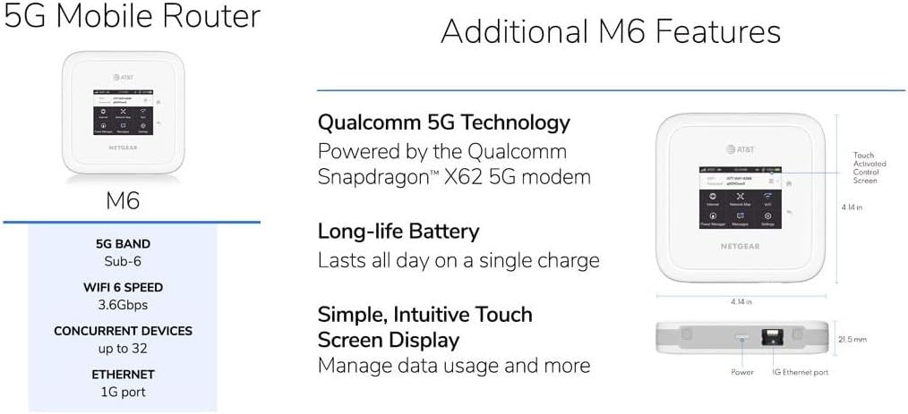 Nighthawk M6 5G: Sub-6 WiFi Bands: WiFi 6, up to 3.6Gbps Devices: Up to 32 Ethernet: 1G port Elevate your mobile WiFi experience to new heights with WiFi 6 and incredible 5G speeds. The Nighthawk M6 mobile router is powered by the Qualcomm Snapdragon X62 5G modem-RF system to deliver superior performance and breakthrough speeds. This mobile router combines dual-band 2.4GHz and 5GHz WiFi 6 with AX3600, making it an ideal device for enabling secure WiFi for up to 32 devices on the go, or staying connected on a 5G network at home. RELIABLE 5G THAT WORKS: When time matters, ensure you always have a fast connection that’s secure, private, and shareable with up to 32 devices. EASY TO SET UP, EASY TO USE: Get your WiFi up and running, change settings, and monitor data usage using the intuitive, extra-large touchscreen. LONG-LASTING POWER: Rechargeable battery for all-day use. Swap out the battery for a second one (sold separately) or use the AC adapter if you need even more power.