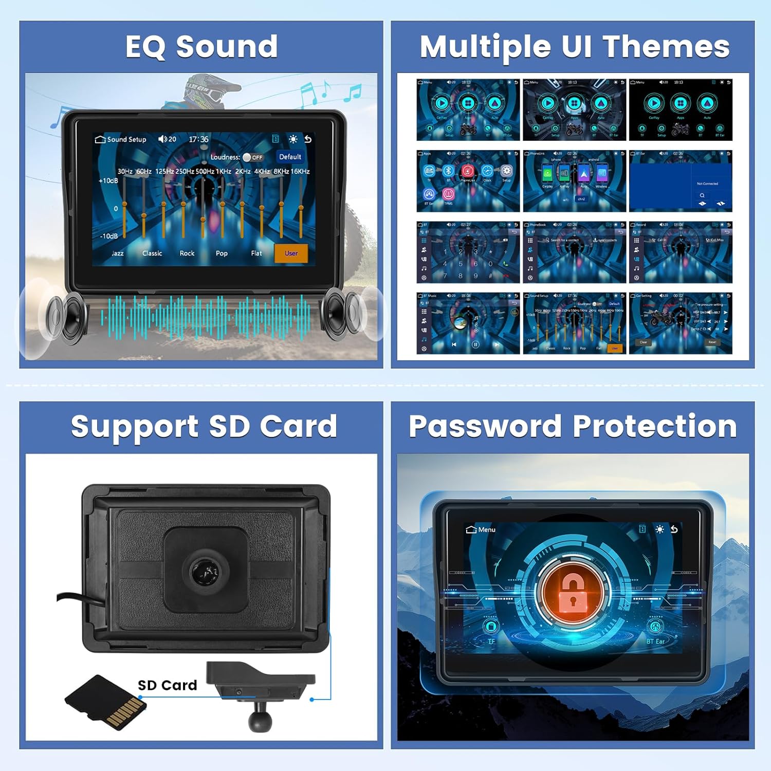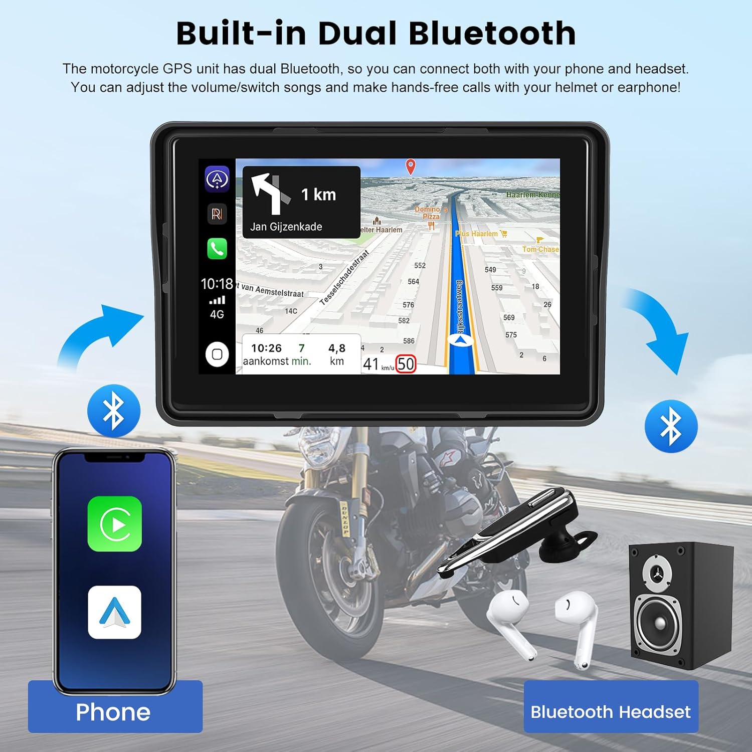 【Built-in Dual Bluetooth & Equalizer Settings】The motorcycle GPS unit has dual Bluetooth, so it can connect with both your phone and headphones. You can adjust the volume/change songs and make hands-free calls with your headset or headset! Motorcycle GPS navigation equipped with multi-band EQ mode, adjusting FGR/super bass crossover frequency, bass, heavy bass, mid, mid-treble and super treble, excellent noise reduction, bass boost amplification, create an immersive musical feast.