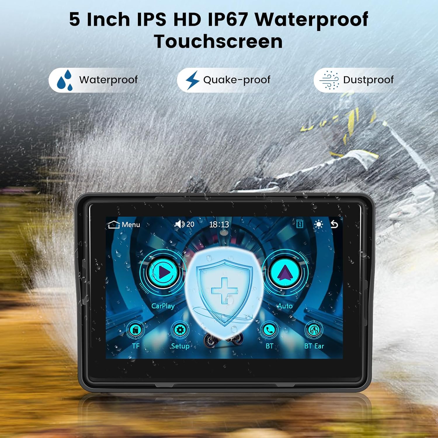 【5 inch HD IPS touch screen and IP67 waterproof】Perform all functions directly on the motorcycle's CarPlay touch screen. Enjoy video playback at 1280 x 480 resolution, displaying vivid details visible even under strong outdoor sunlight for optimal comfort. Adjust screen brightness for any condition while maintaining realistic colors. Designed with IP67 waterproof rating, ensuring excellent performance in wet and rainy conditions. Different angles can be customized according to needs.