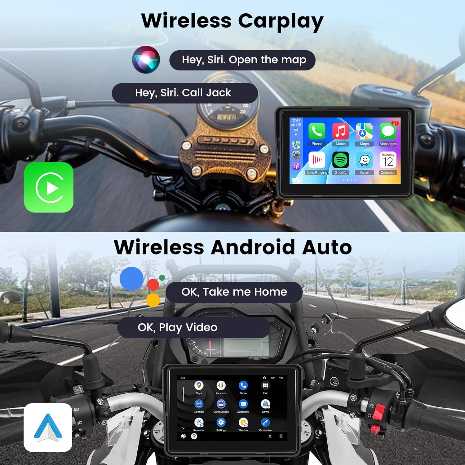 【Motorcycle Wireless Car Play and Android Auto Screen】This motorcycle Carplay screen allows drivers to connect their phones wirelessly to access essential functions such as calls, navigation and music playback directly from the screen. It is compatible with CarPlay and Android Auto, allowing voice control through Google and Siri, ensuring hands-free operation while driving. It is a convenient solution for motorcycle enthusiasts who want seamless integration with their smartphone while riding.