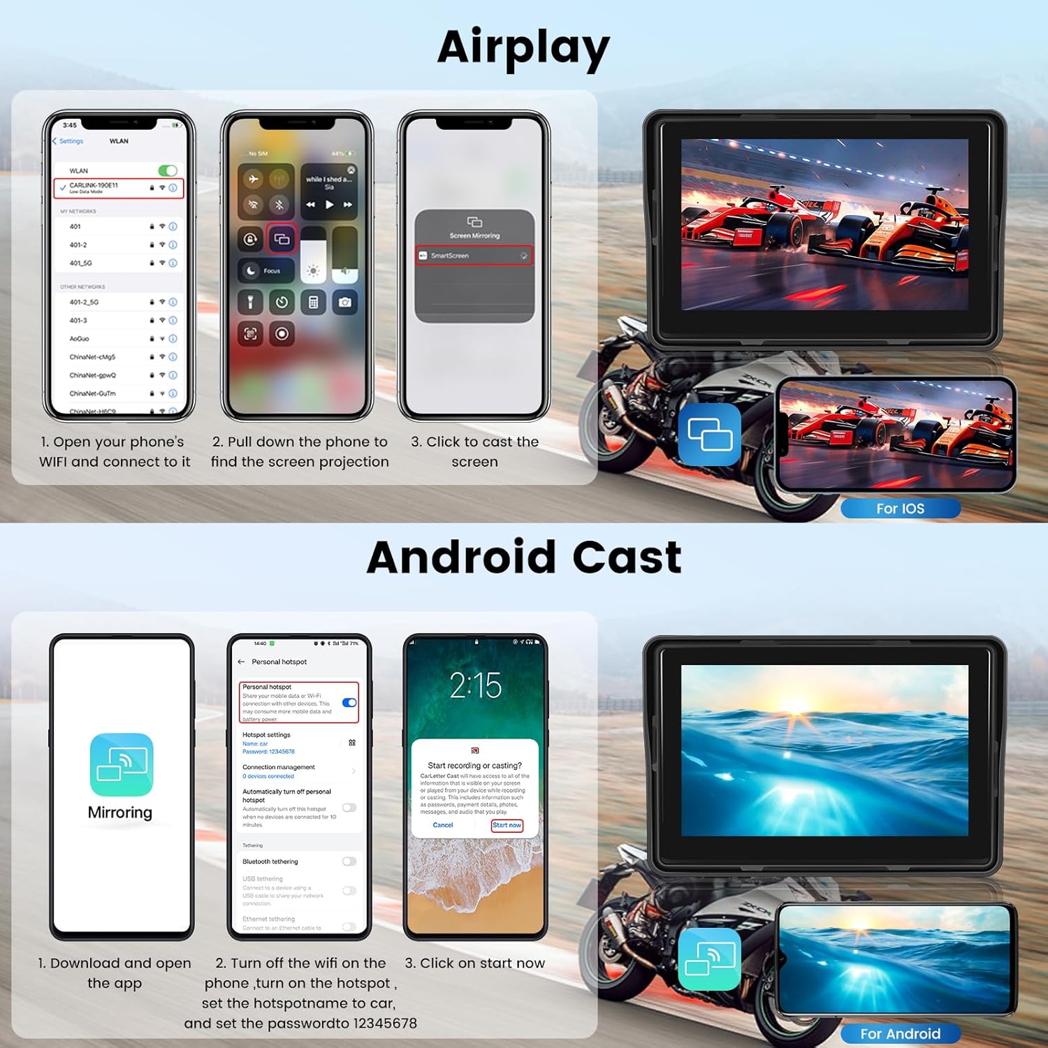 【NHOPEEW Motorcycle Dash Cam】Upgraded motorcycle dash cam with wireless Apple CarPlay, Android Auto, setting an open screen password to protect privacy. Wirelessly pair your smartphone to your motorcycle's touchscreen via Bluetooth for seamless access to navigation, calling, music, messaging and more using Siri or Google Assistant. Effortlessly connect to BT headphones or speakers for hands-free operation, ensuring safer driving with full concentration on the road.