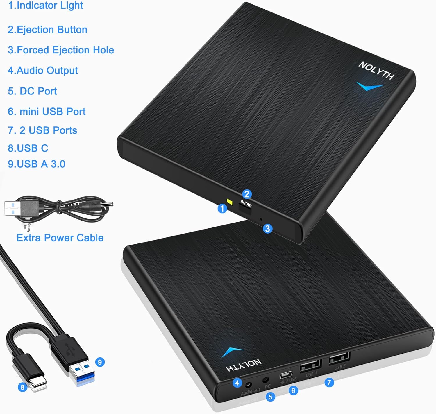 Plug and reproduction: Nolyth External CD Drive for laptop with USB Type-C/USB 3.0 connector, so simply connect it to its USB C or USB port and this external CD/DVD computer for PC will be automatically detected, no additional controller program is required. When you play this external USB DVD unit on your computer, you can load your phone or connect the USB mouse/keyboard to work with your computer through the 2 USB ports.