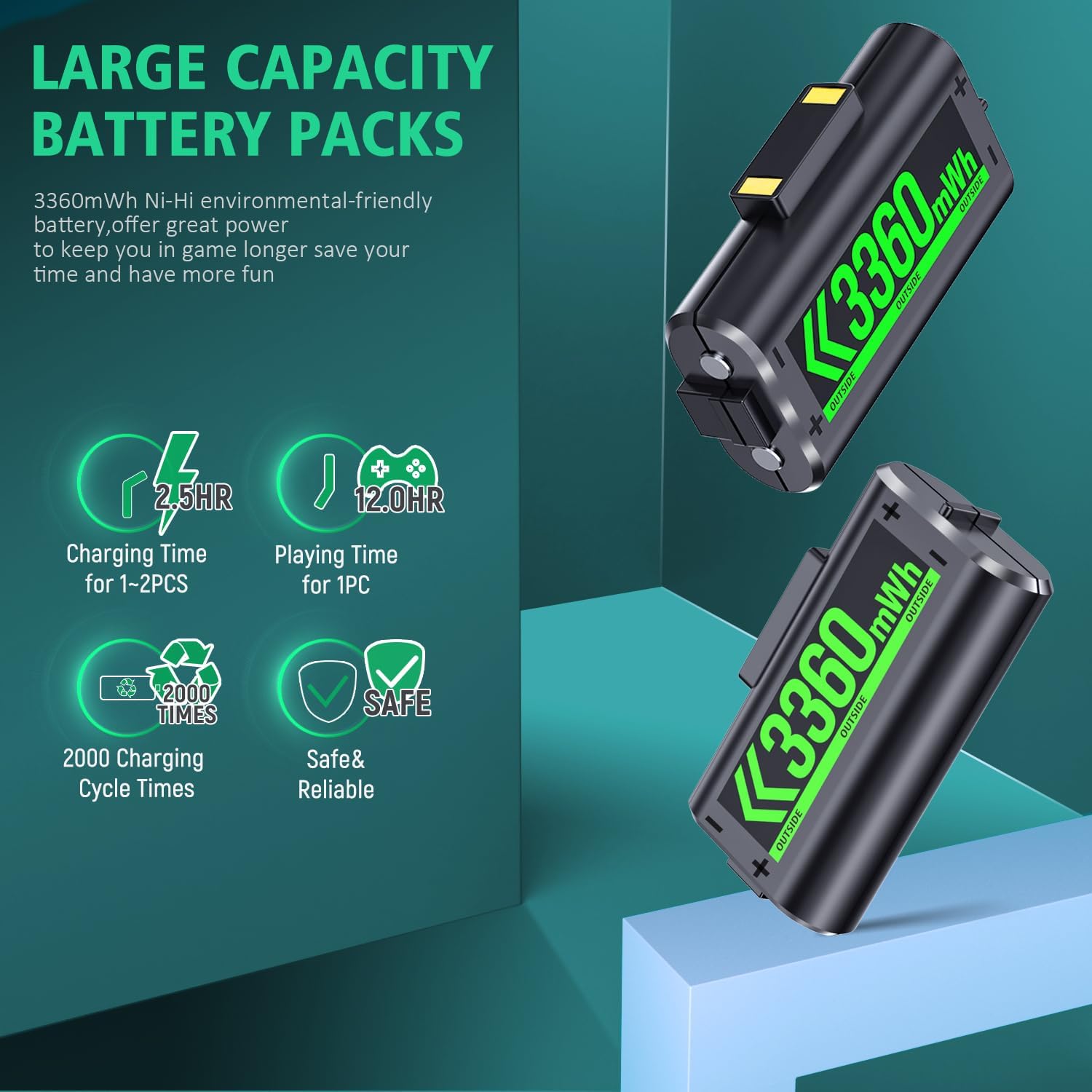 🎮【Large Capacity & Rechargeable Battery Packs】The package includes a controller charging station and rechargeable batteries for all Xbox remotes. The rechargeable battery pack for Xbox One is a perfect replacement kit for you. And the Xbox One controller rechargeable battery pack can be charged separately, it only takes 2.5 hours to charge 2 x series rechargeable batteries.
