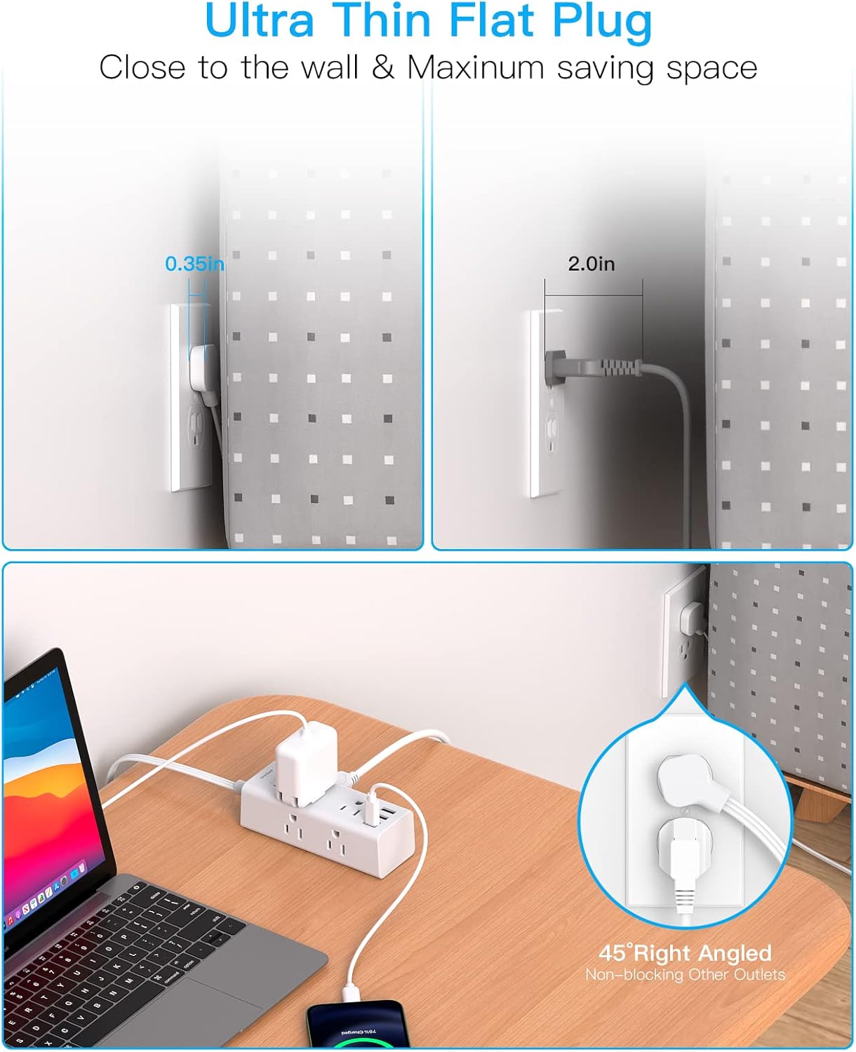 45° right-angled thin flat plug makes it easily to plug in and out behind the furniture, will not block the bottom receptacle of duplex wall outlet.