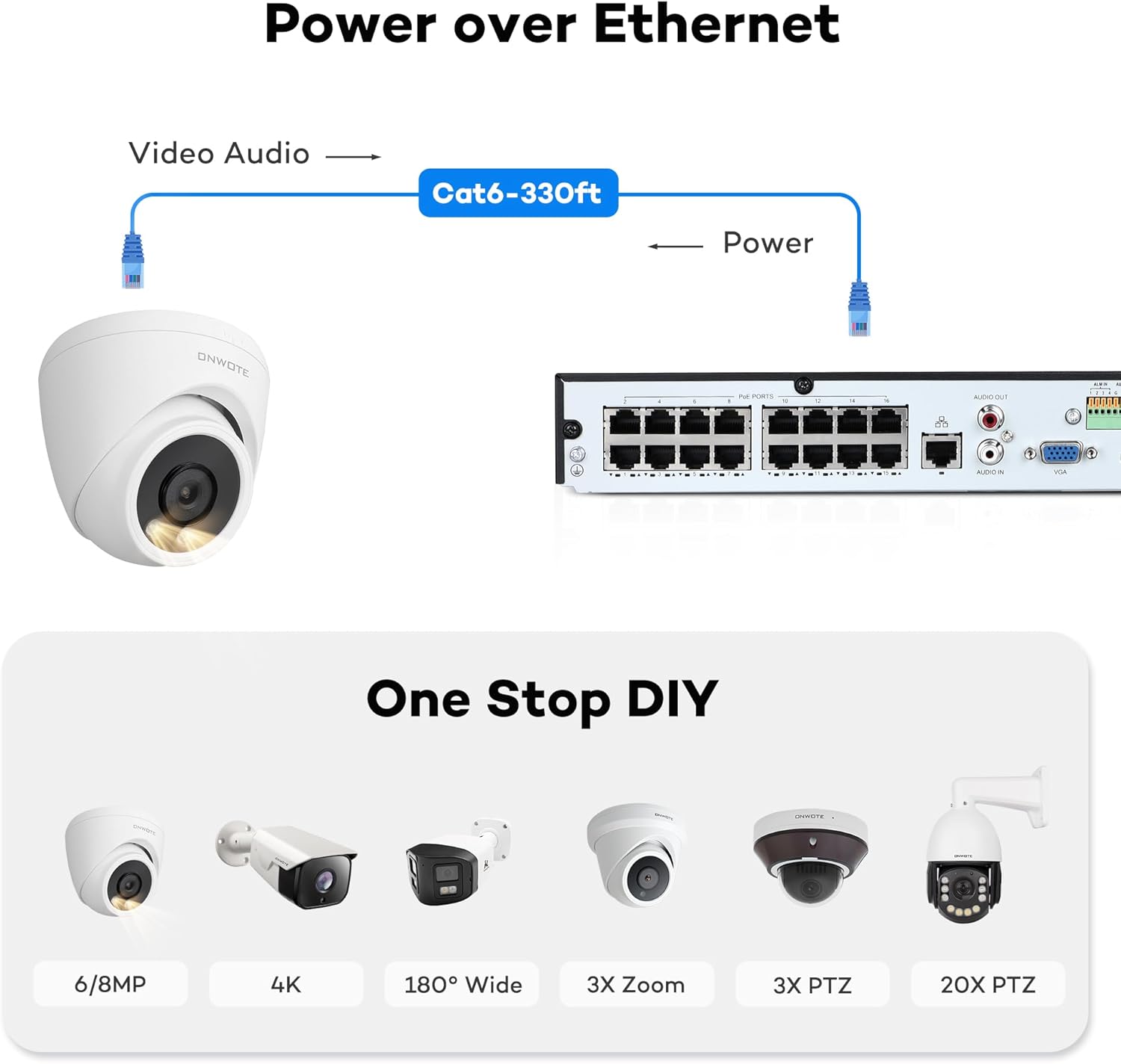 Power over Ethernet, Plug and Play. PoE NVR provides power to cameras over Ethernet cables.